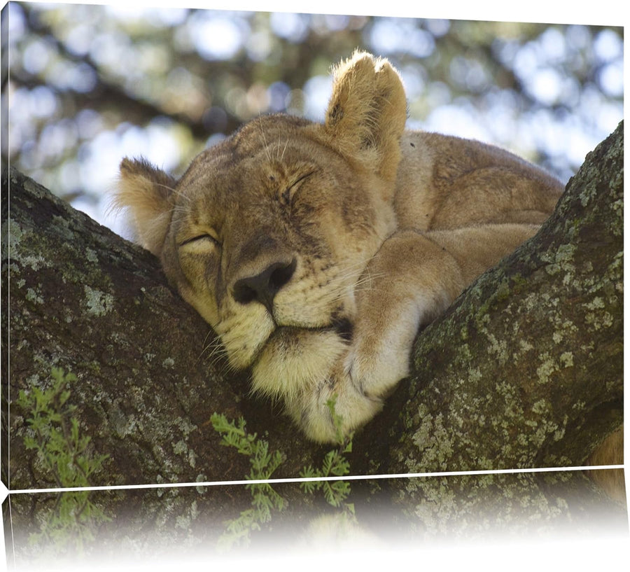 müde Löwin ruht auf Baum Leinwand, XXL riesige Bilder fertig gerahmt mit Keilrahmen, Kunstdruck auf