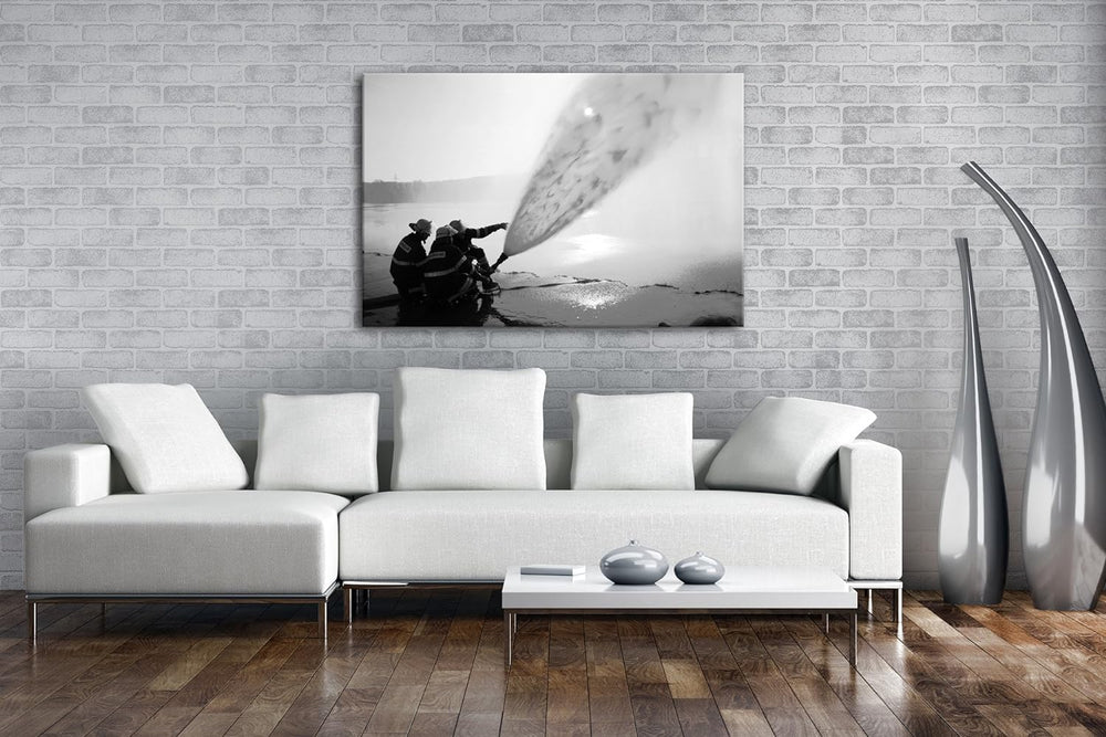 deyoli Löscharbeiten bei Feuer Effekt: Schwarz/Weiss Format: 60x40 als Leinwandbild, Motiv fertig ge
