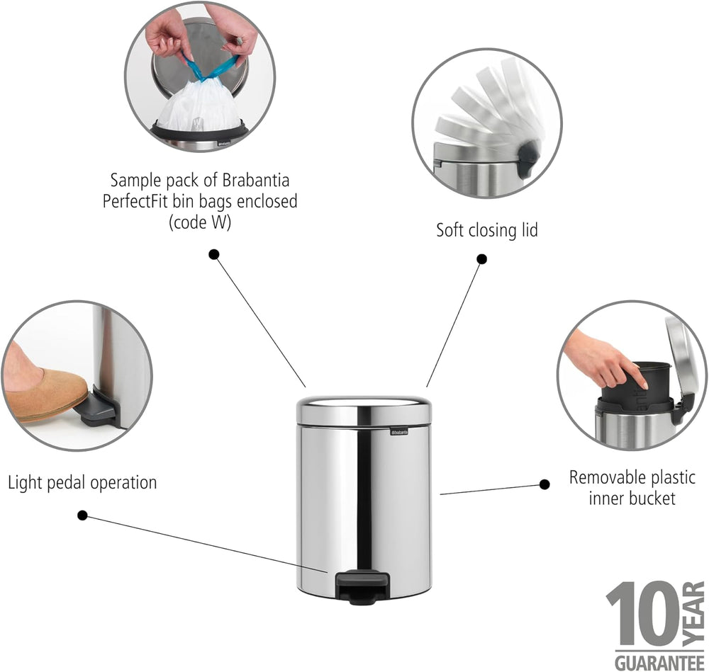 Brabantia Treteimer mit Inneneimer aus Kunststoff, stahl, Brilliant Steel, 5L, Brilliant Stahl 5 Lit