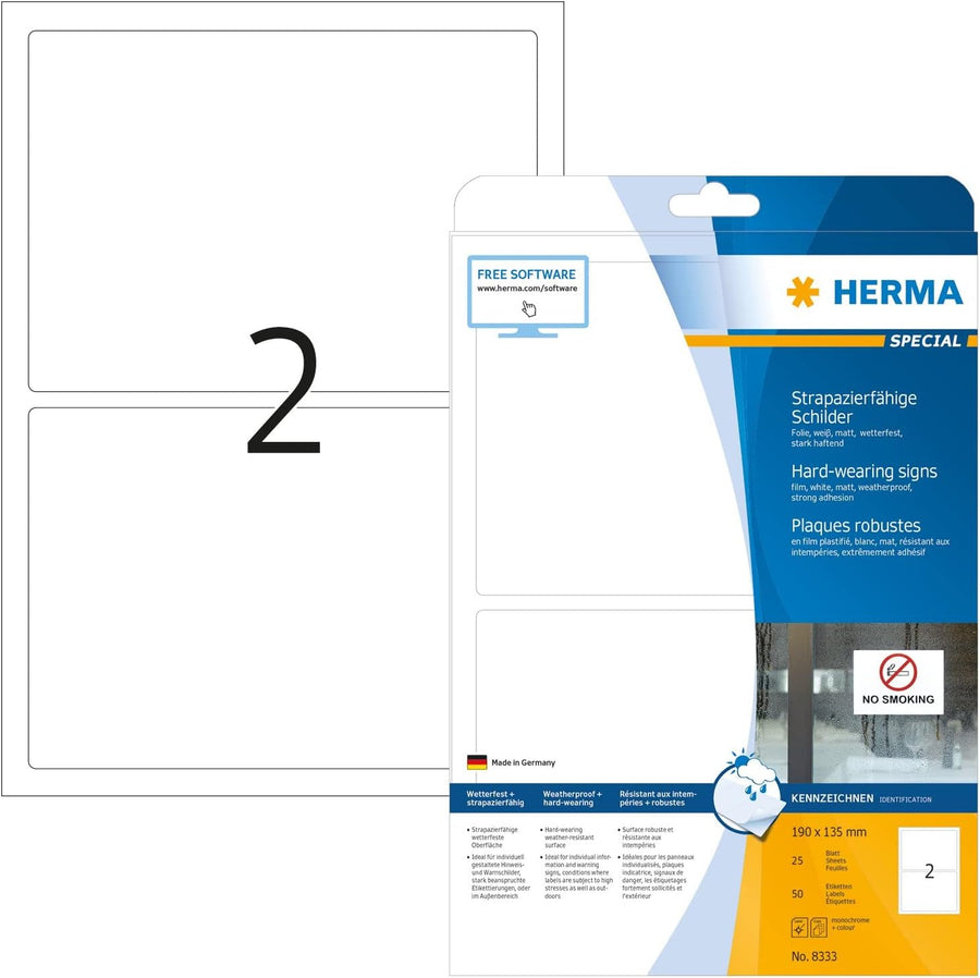 HERMA 8333 Wetterfeste Folienetiketten, 25 Blatt, 190 x 135 mm, 2 Stück pro A4 Bogen, 50 Aufkleber,