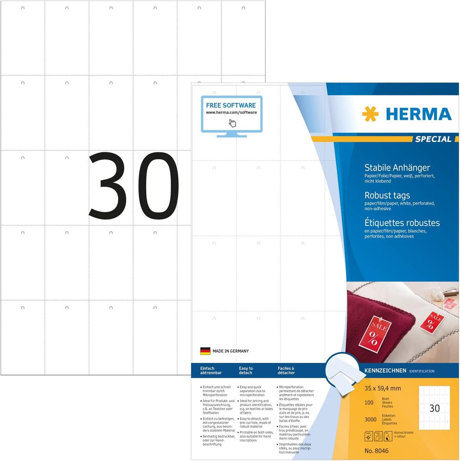 HERMA 8046 Stabile Anhänger perforiert, 100 Blatt, 35 x 59,4 mm, 30 Stück pro A4 Bogen, 3000 Preisan