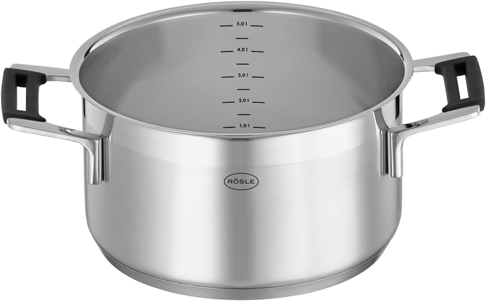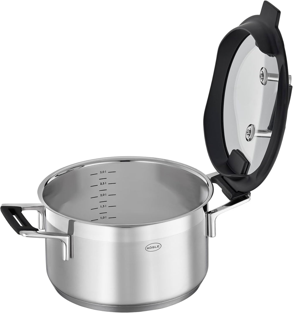 RÖSLE SILENCE PRO Kochtopf, Hochwertiger Universaltopf aus Edelstahl 18/10, 20 cm, Glasdeckel, Innen