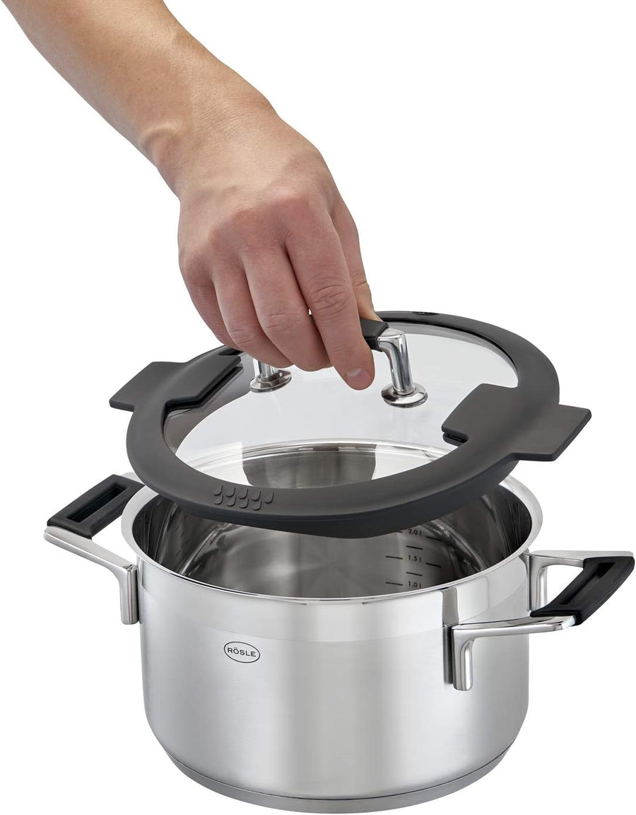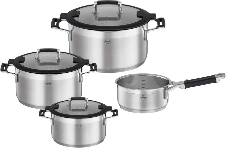 RÖSLE SILENCE PRO Topf-Set 4-teilig, hochwertiges Universaltopfset mit 3 Kochtöpfen und 1 Stielkasse