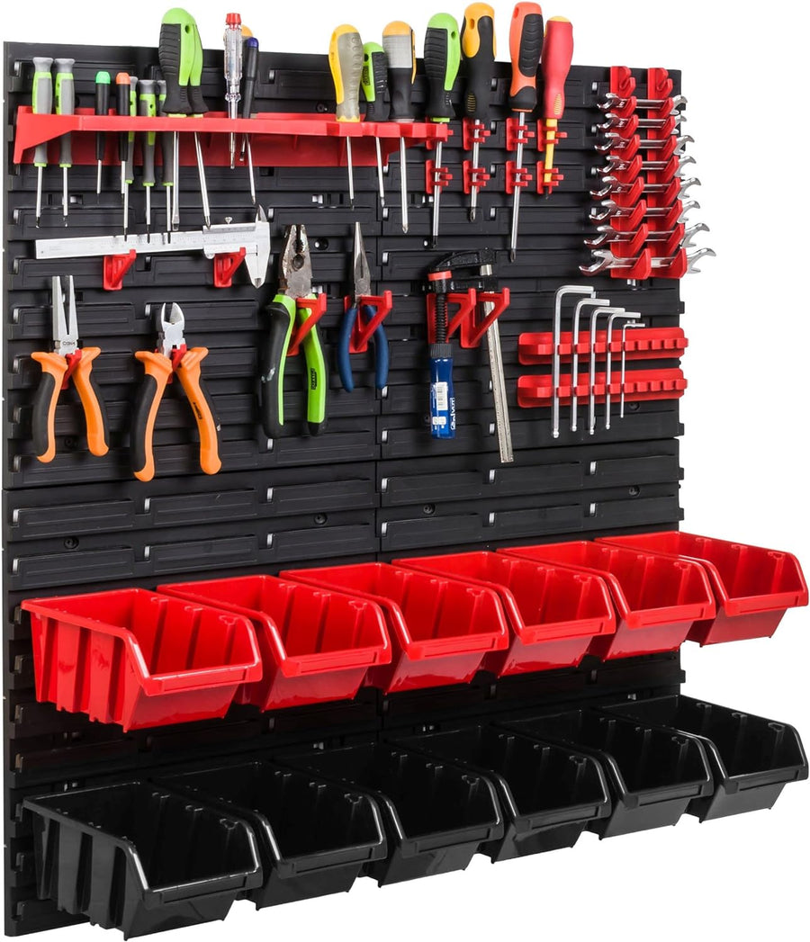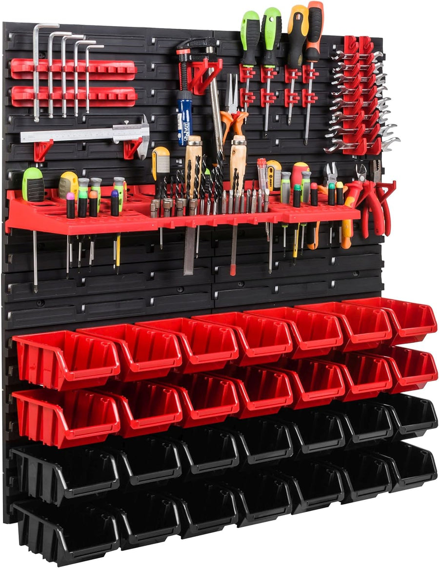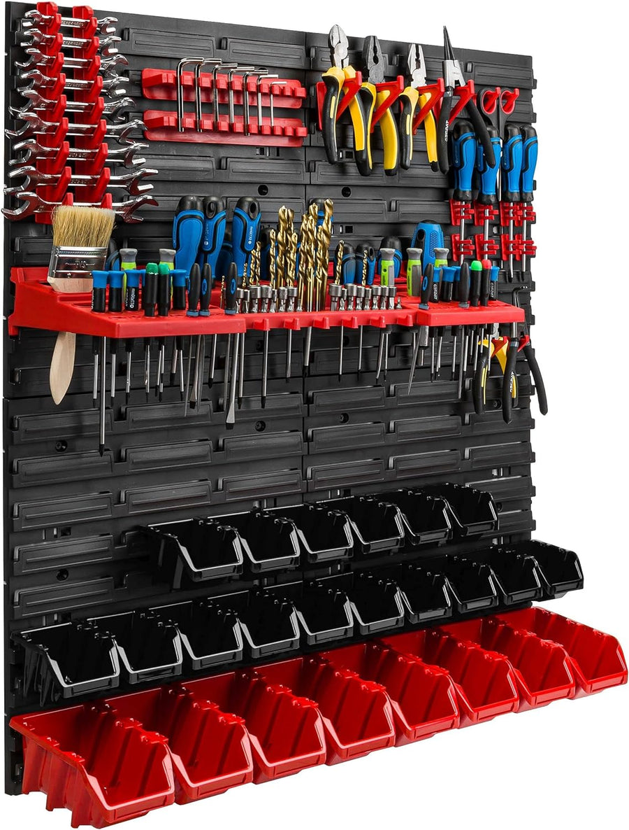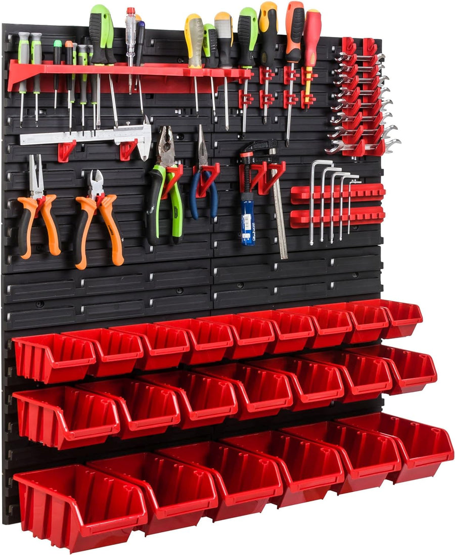 Lagersystem Werkstattregal | 78 x78 cm | 28 stck. Box | Wandregal mit Werkzeughalterungen und Stapel