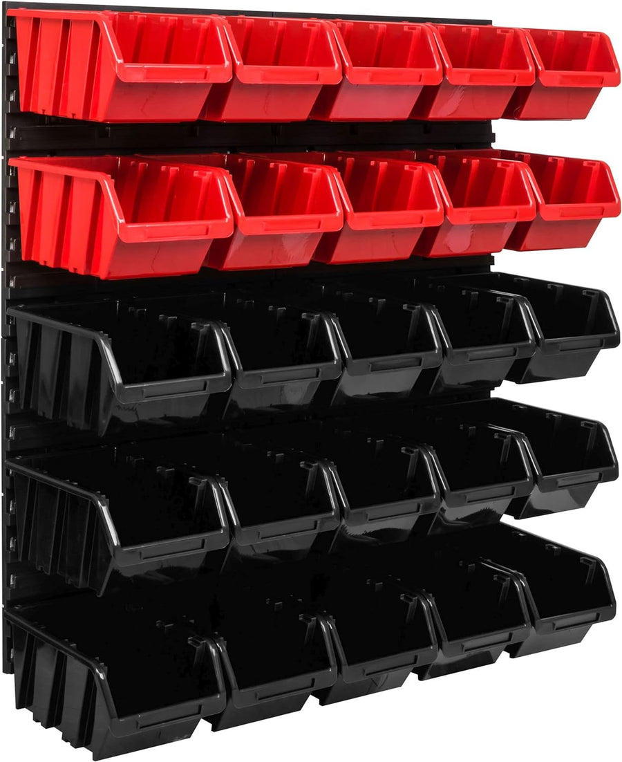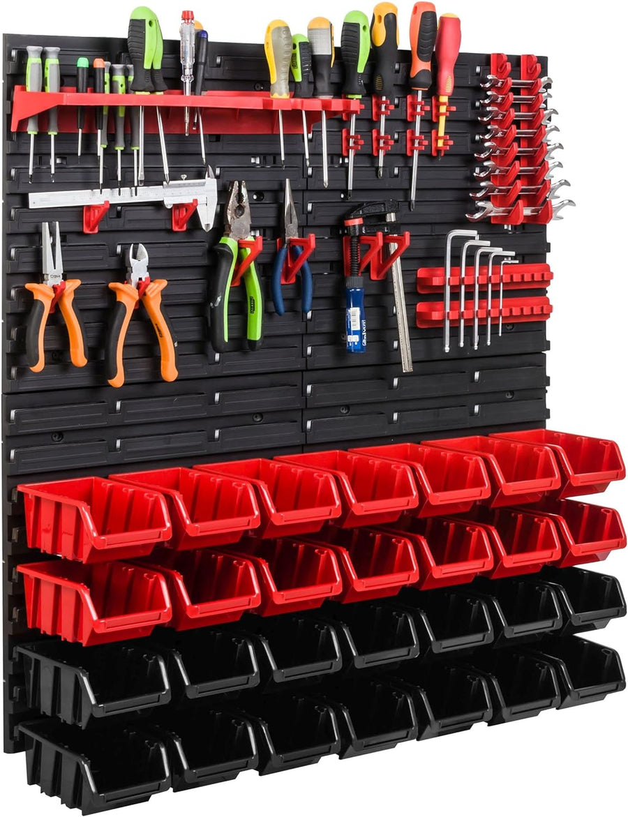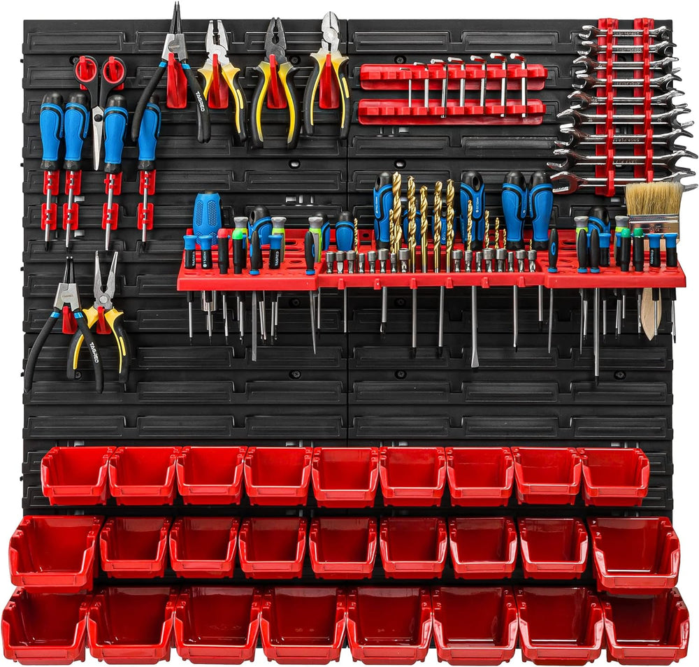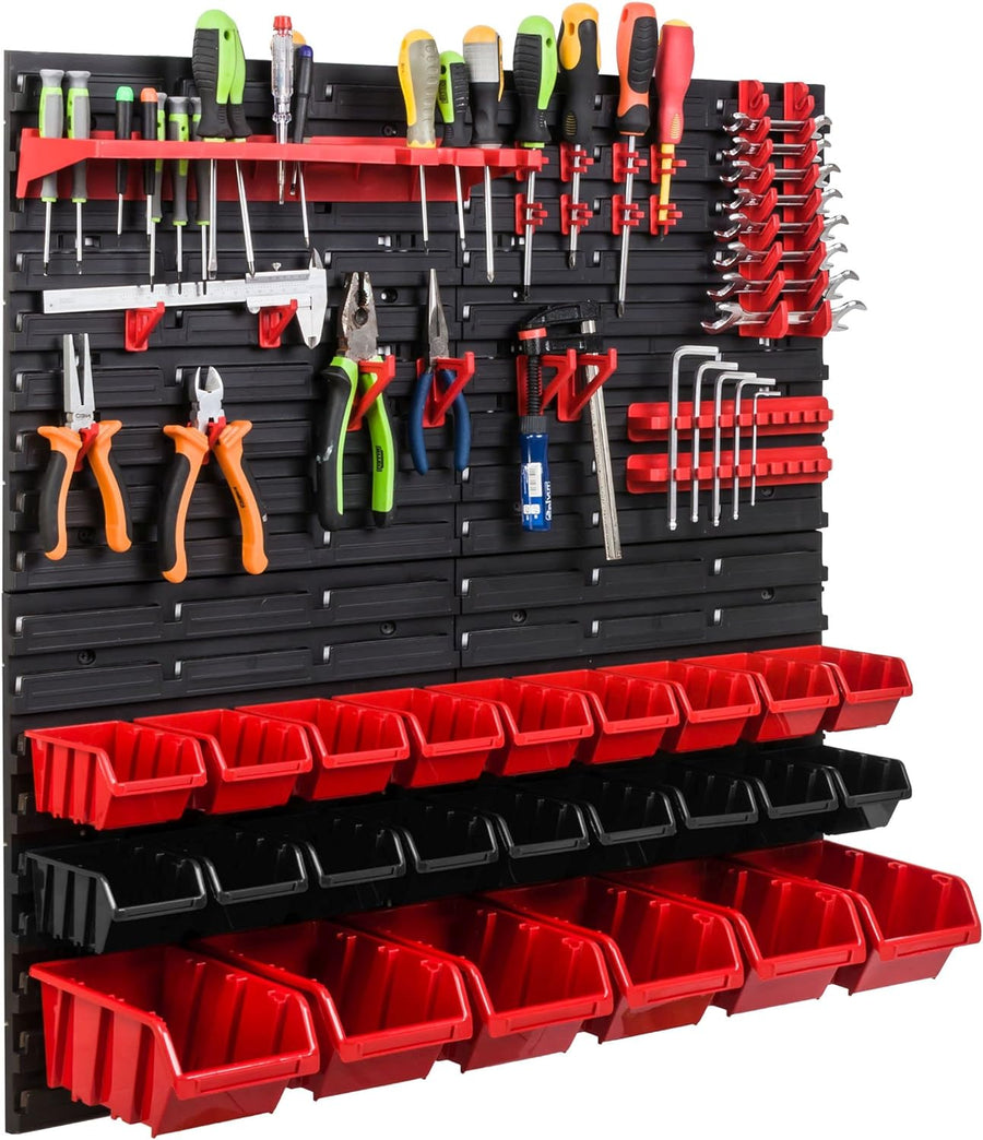 Lagersystem Werkstattregal | 78 x78 cm | 28 stck. Box | Wandregal mit Werkzeughalterungen und Stapel