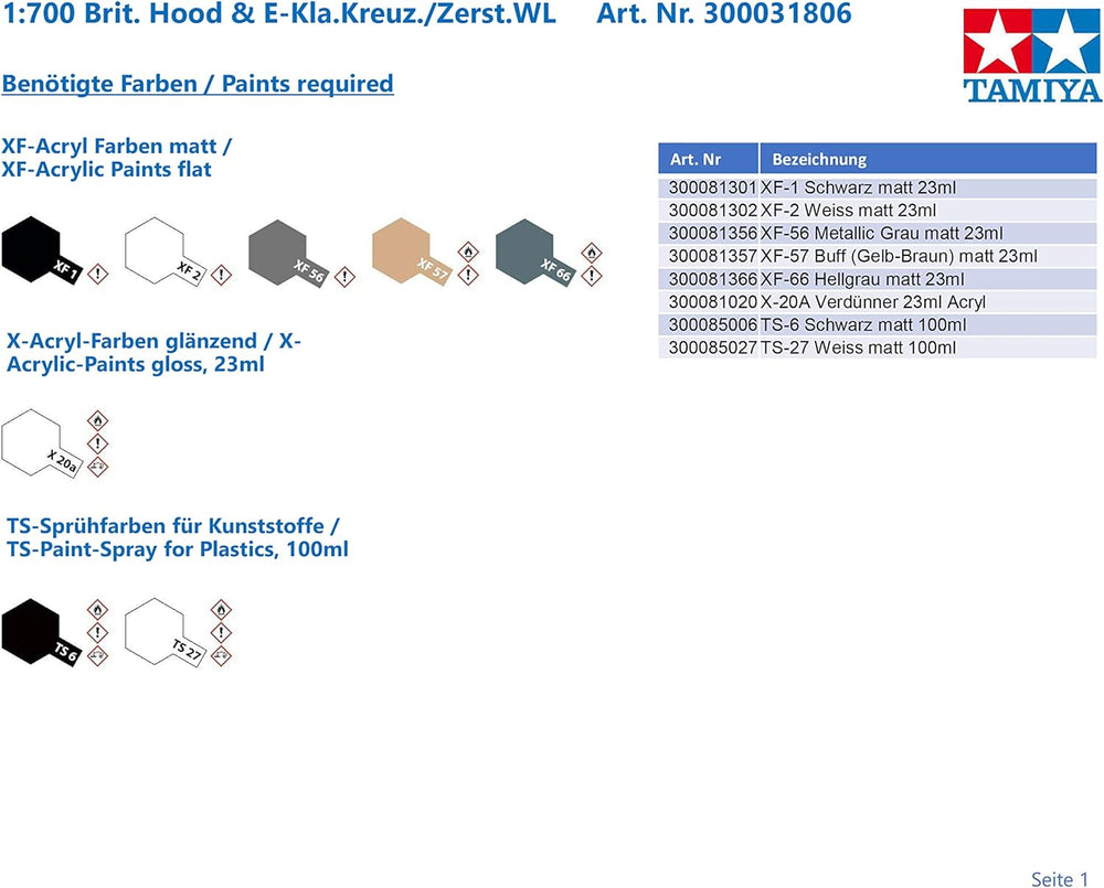 TAMIYA 31806 Militär 1:700 Brit. Hood & E-Kla.Kreuz./Zerst.WL, Modellbau, Plastik Bausatz, Basteln,