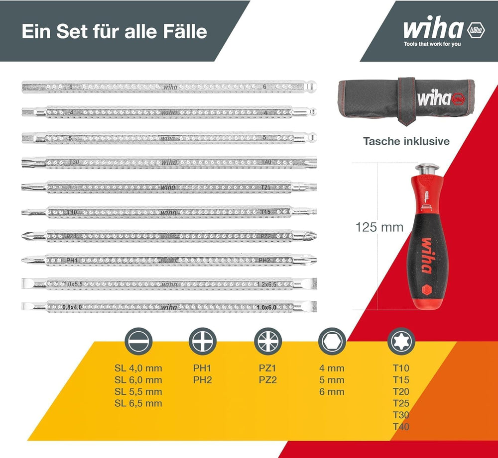 Wiha Schraubendreher mit Wechselklingen Set SYSTEM 6 (27713), 13 tlg. für tiefliegende Schrauben, In