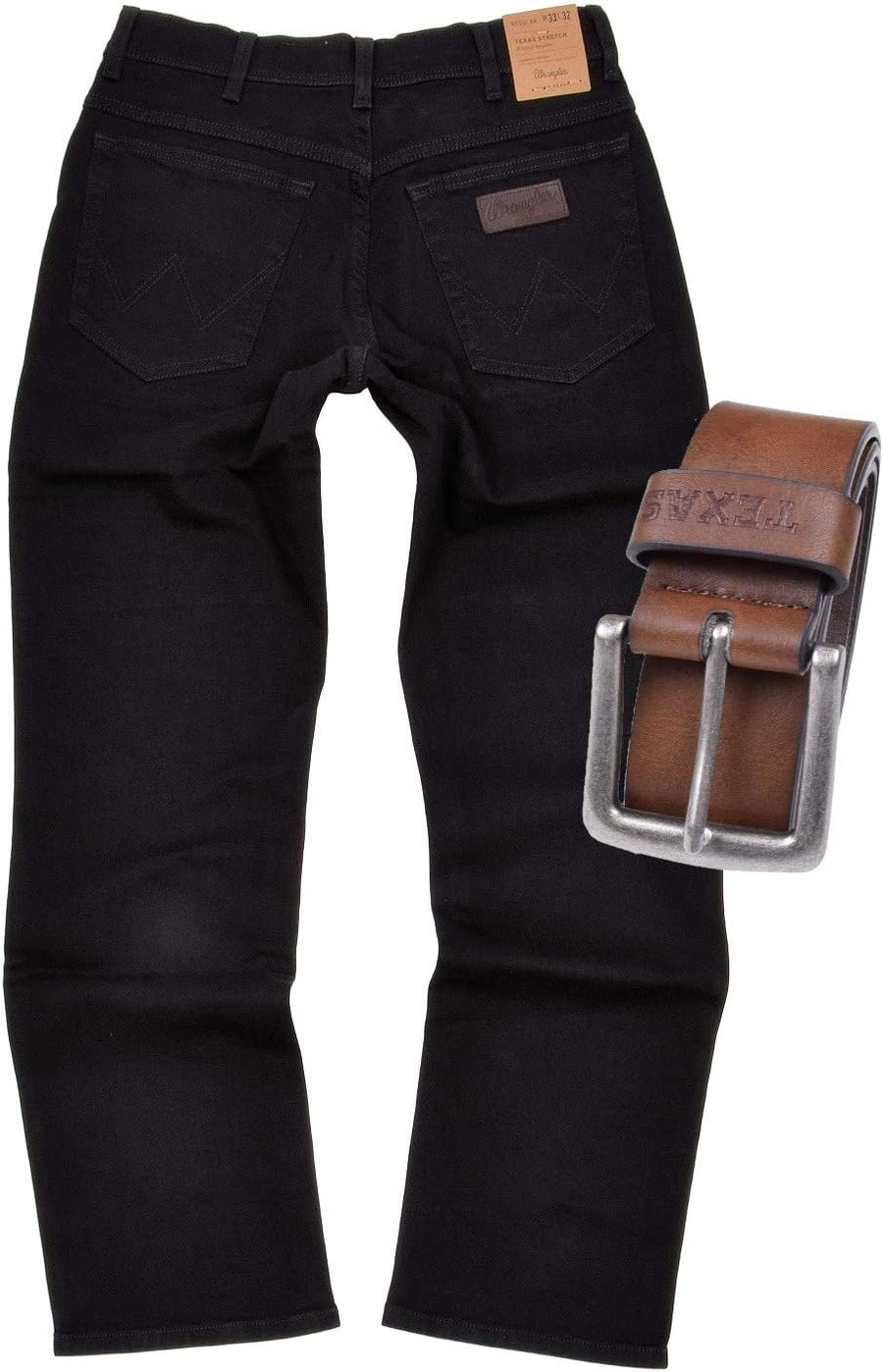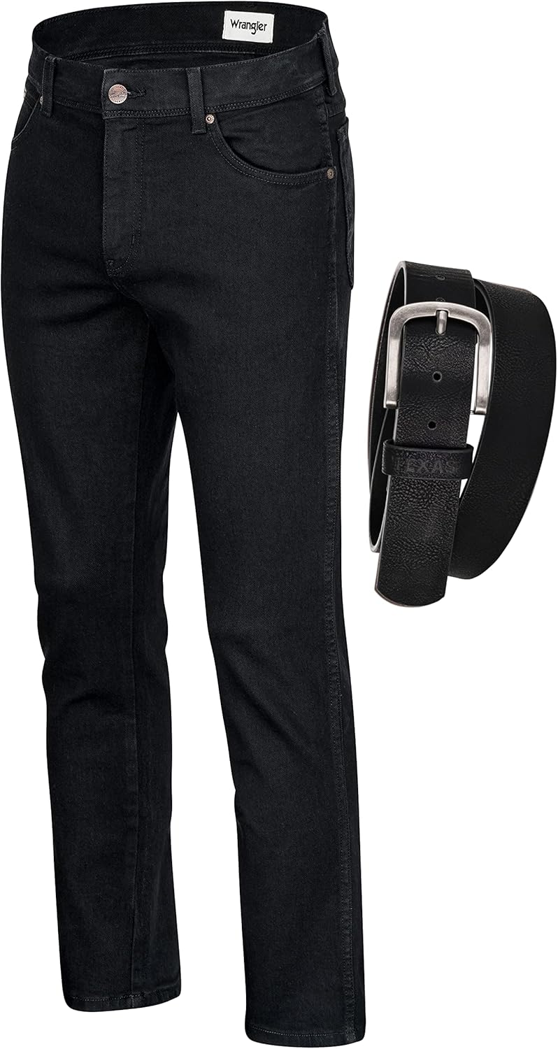 Wrangler Texas Stretch Herren Jeans Regular Fit inkl. Gürtel (W32/L36, Black)