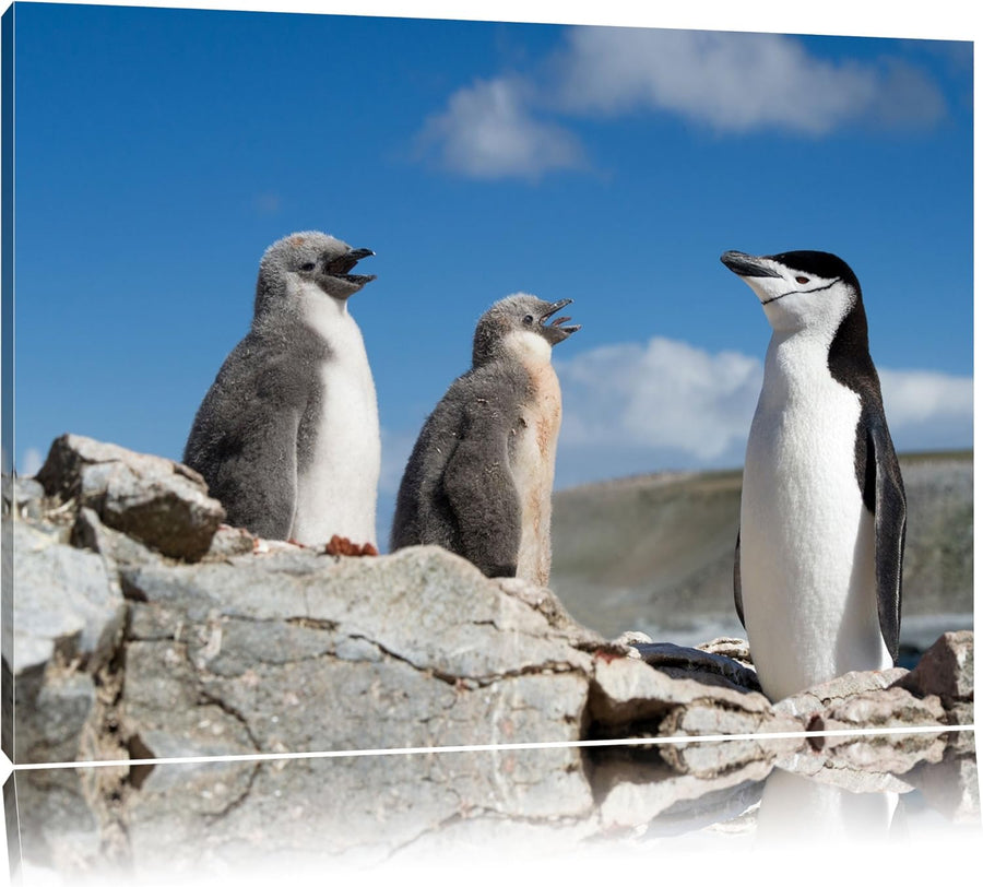 Pinguin mit süssen Küken Format: 100x70 auf Leinwand, XXL riesige Bilder fertig gerahmt mit Keilrahm