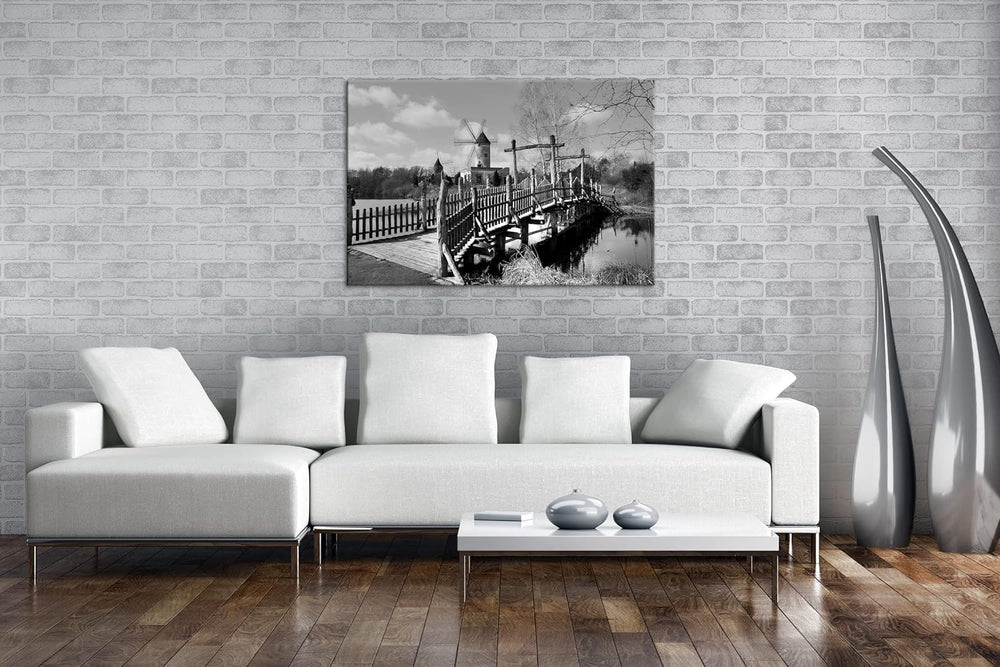 deyoli Mühlenwerke am sonnigen See Format: 80x60 als Leinwand, Effekt: Schwarz&Weiss, Motiv fertig g