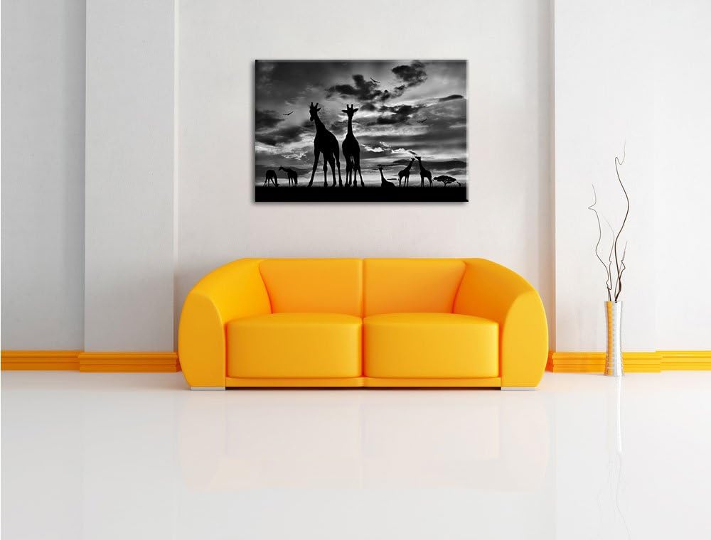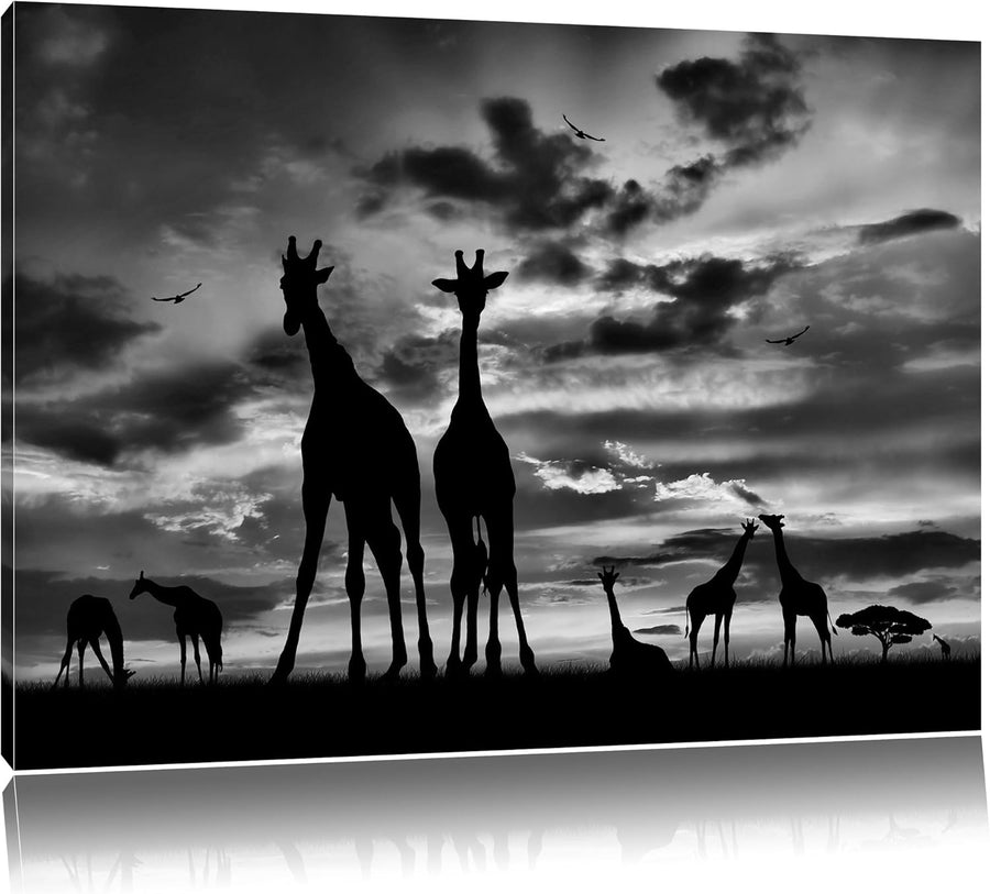 Pixxprint Afrika Giraffen im Sonnenuntergang schwarz/weiss, Format: 70x70 auf Leinwand, 70x70