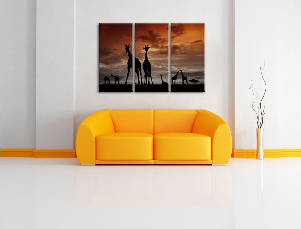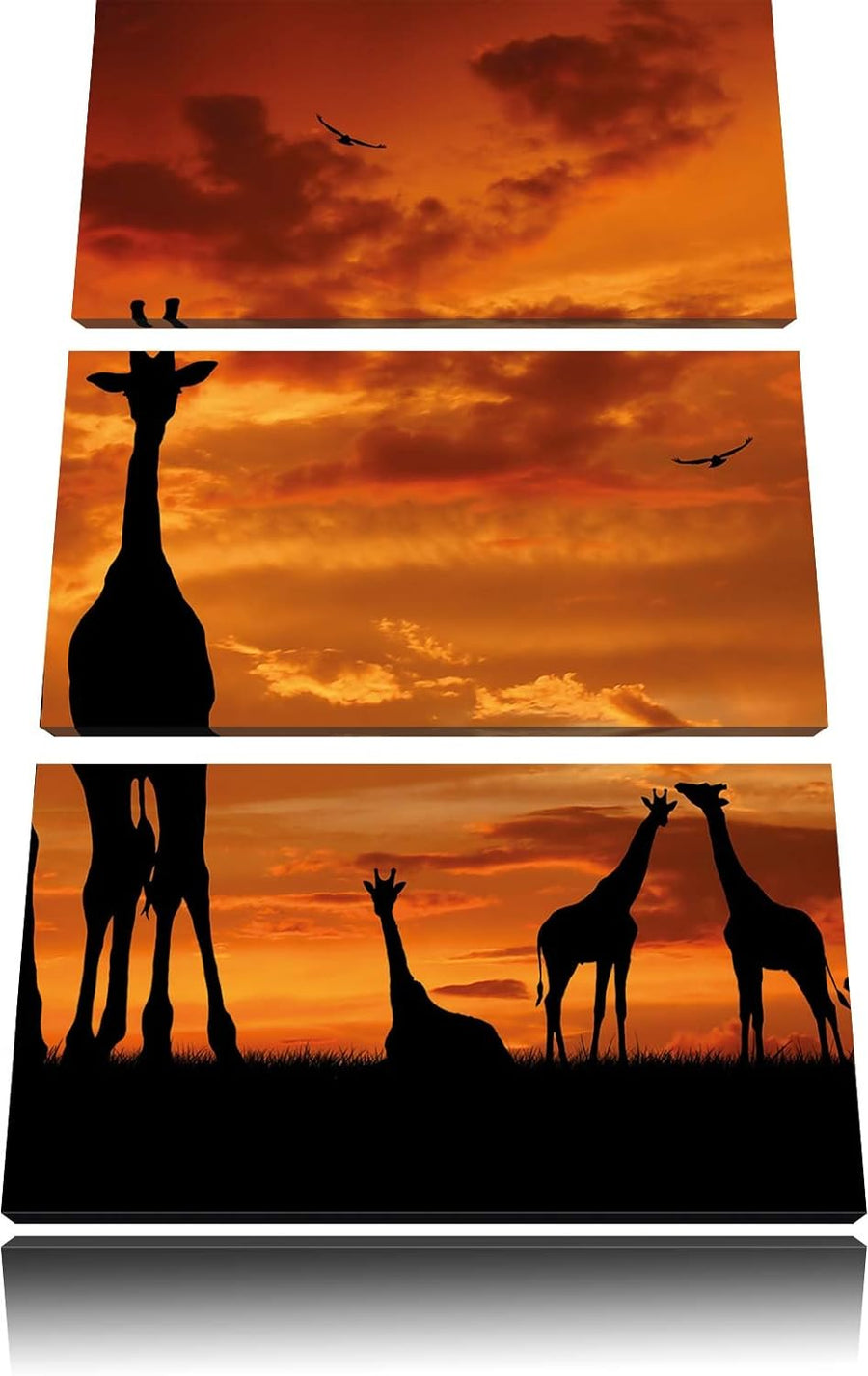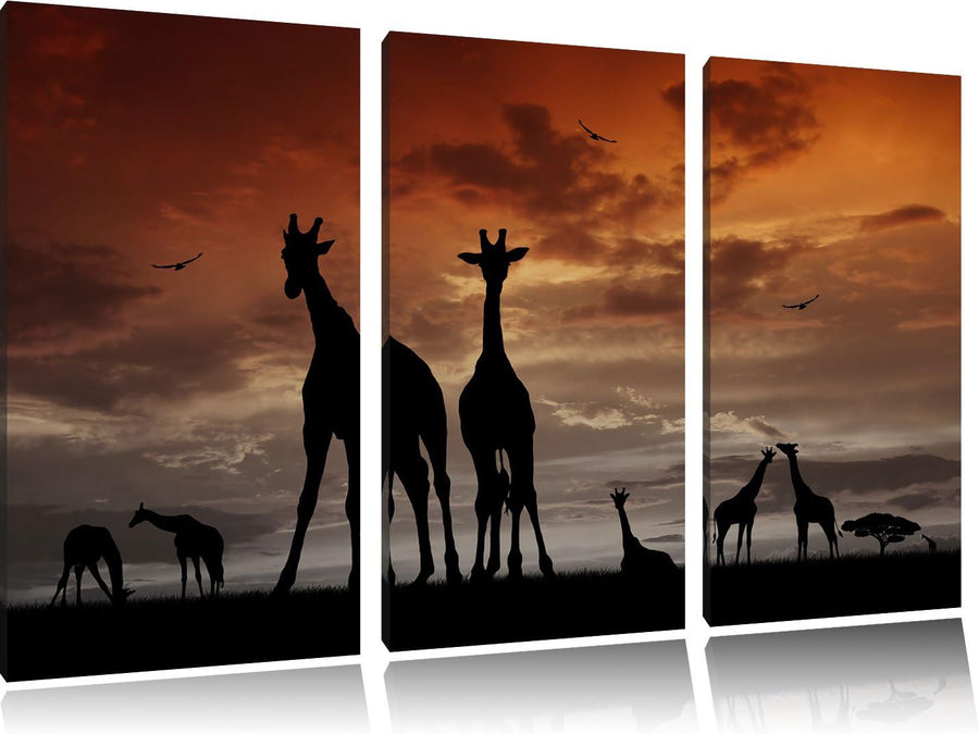 Pixxprint Afrika Giraffen im Sonnenuntergang / 3-Teilig/Gesamtmass 120cm Leinwandbild bespannt auf H