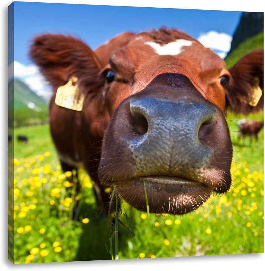 Pixxprint Alpen Kuh auf Bergwiese als Leinwandbild/Grösse: 70x70 cm/Wandbild/Kunstdruck/fertig bespa
