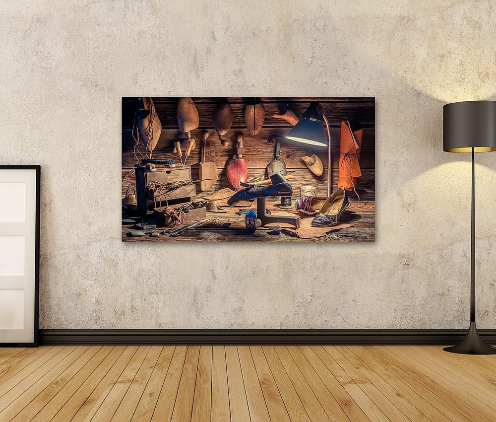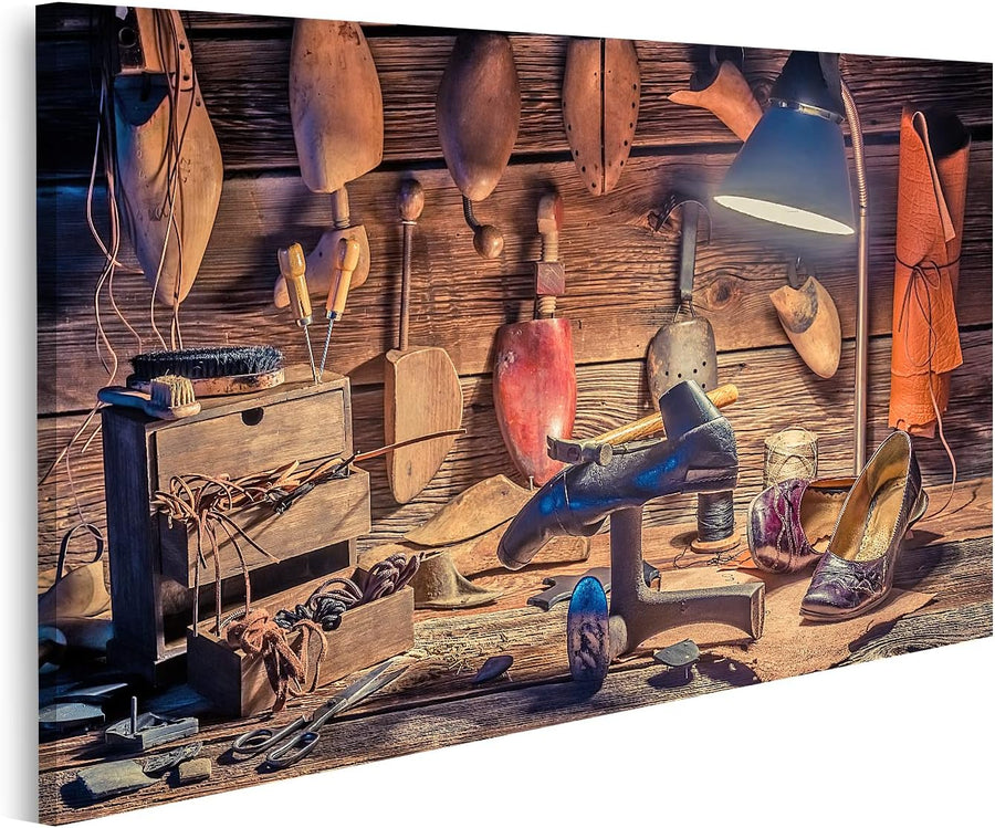 islandburner Bild auf Leinwand Vintage Schuster Arbeitsplatz Mit Pinsel Und Schuhe Wandbild Poster K