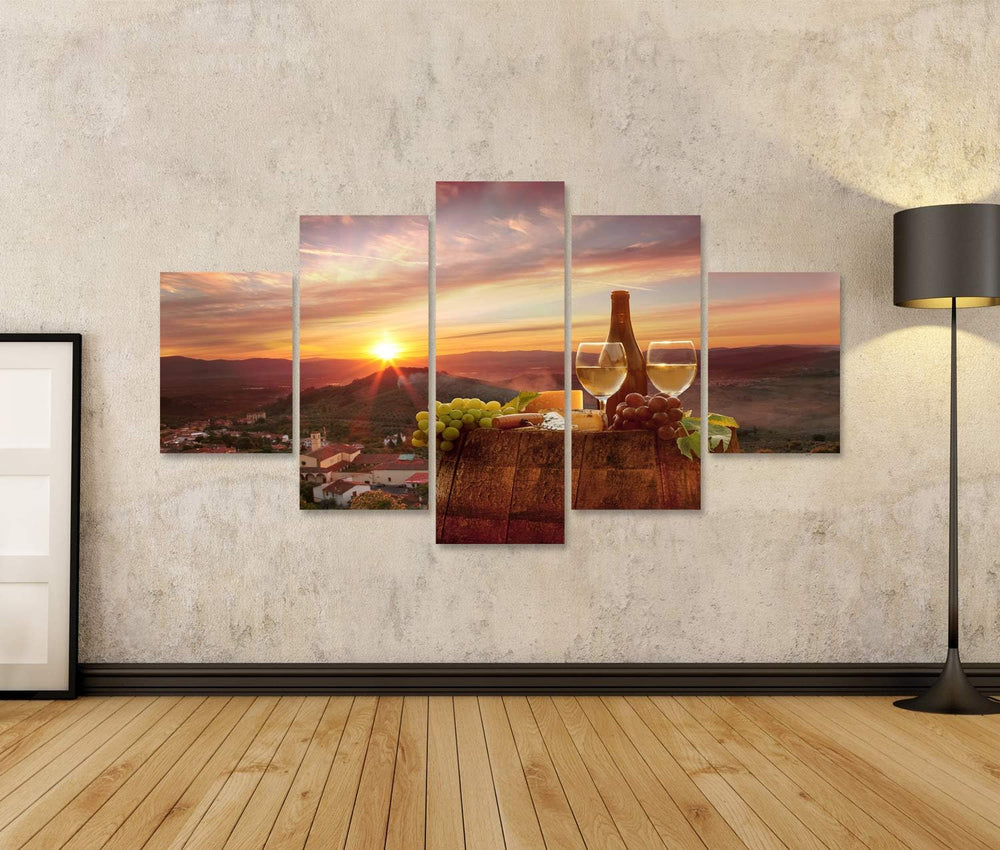 islandburner Bild auf Leinwand Weinflaschen Fässer Weinberg Sonnenuntergang Wandbild Poster Kunstdru