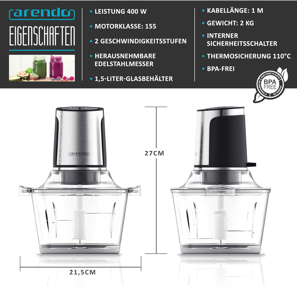 Arendo Power Zerkleinerer 400 Watt mit 1,5 L Glasbehälter, Elektrischer Multizerkleinerer, Leistungs