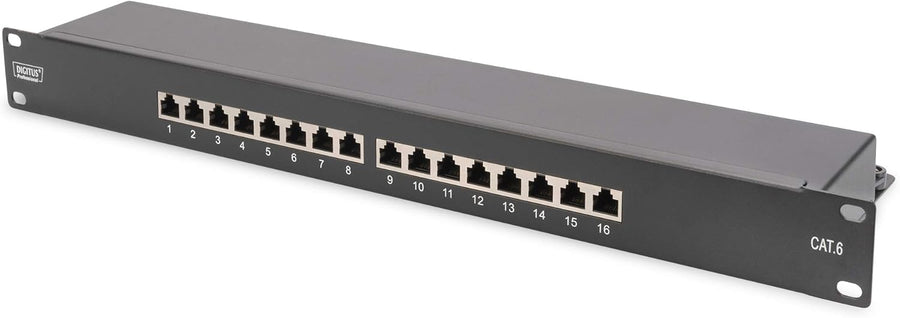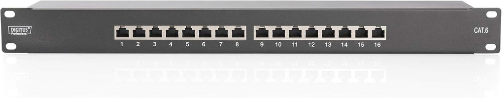DIGITUS Patchpanel - 19-Zoll - Cat-6 - 16-Port RJ45 - Geschirmt - LSA Patch-Feld - Rack-Montage 1HE