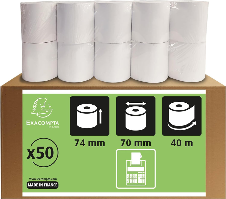 Exacompta 40655E 50er Pack Kassenrollen, 1-lagig Offset(holzfrei) standard, Breite: 74mm, Länge 40m,