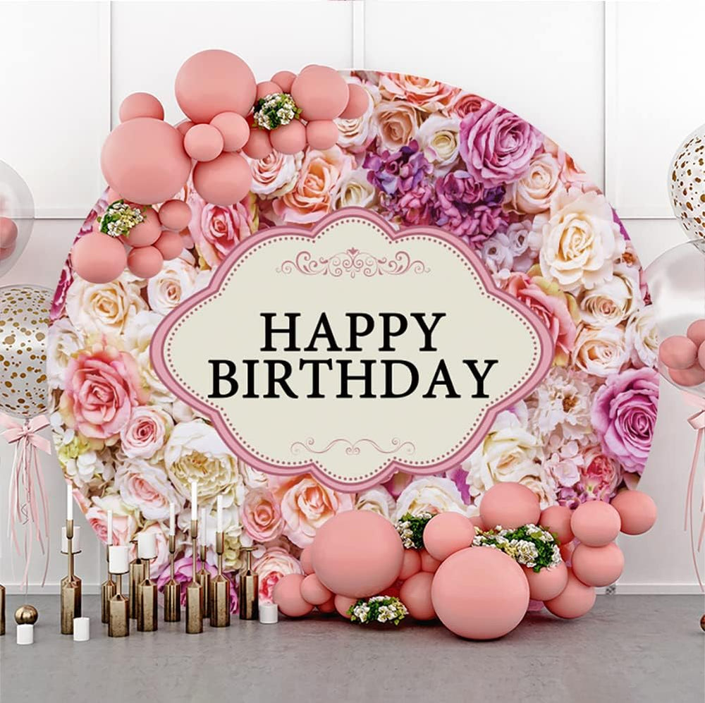Renaiss 2x2m Alles Gute zum Geburtstag Runde Kulisse Rosa Blumen Glitzer Fotografie-Hintergrund Kind