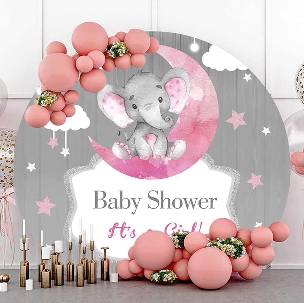 Renaiss 2x2m Elefant Baby Dusche Runde Kulisse für Mädchen Rosa Mond Sterne Polyester Stoff Fotograf