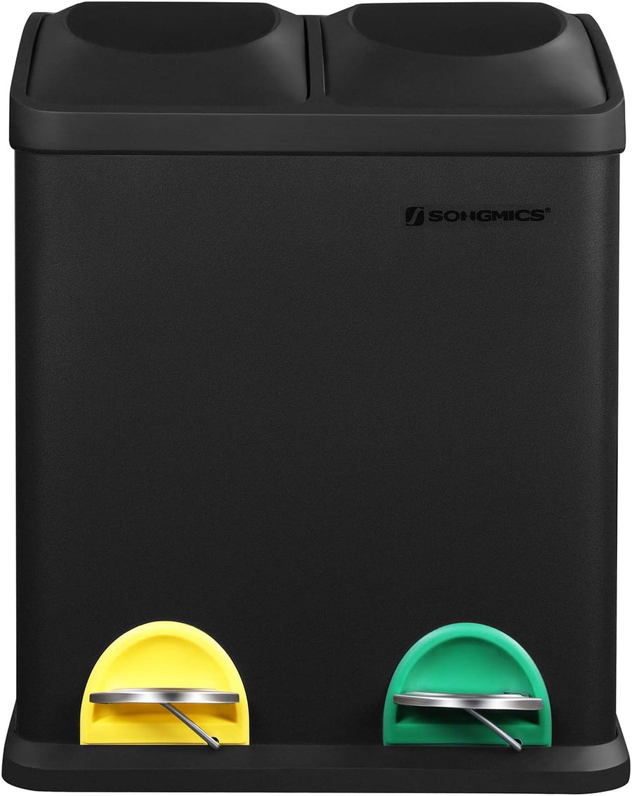SONGMICS Küchenmülleimer, 2 x 15 l, Doppeleimer für Recycling und Abfall, Treteimer mit zwei Fächern