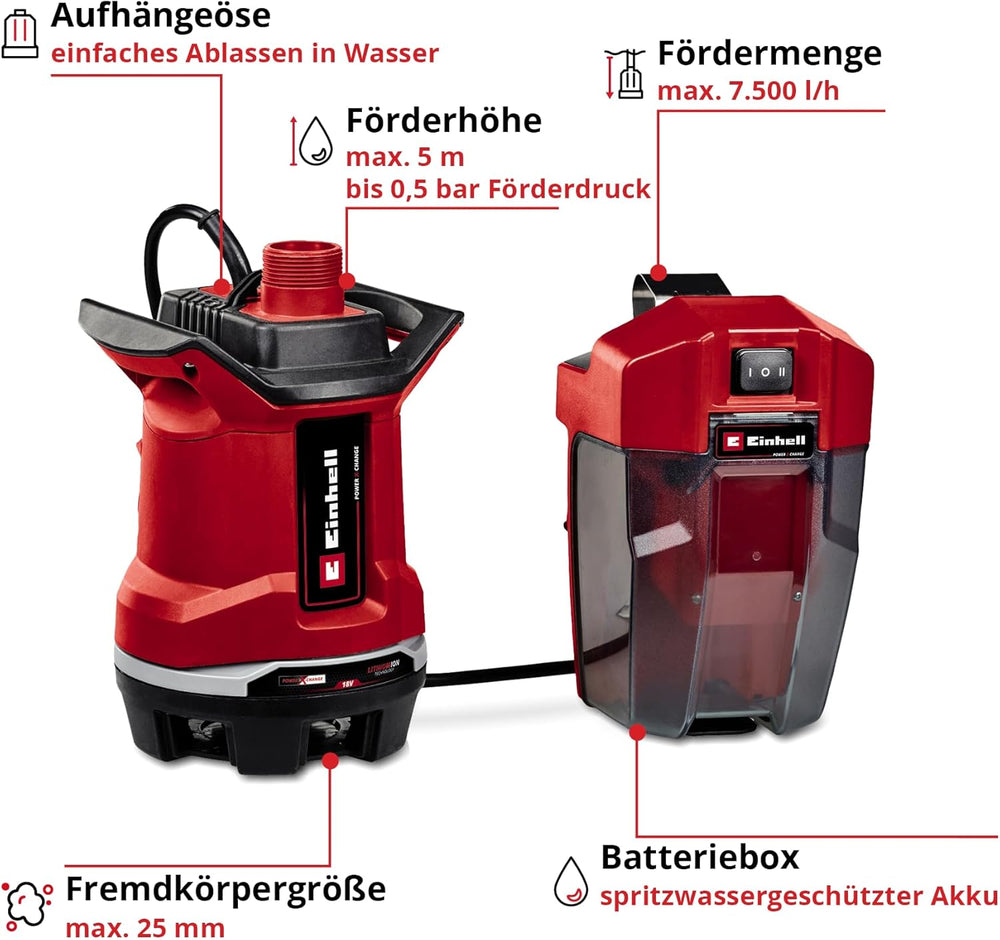 Einhell Akku-Schmutzwasserpumpe GE-DP 18/25 Li Power X-Change (18 V, 7.500 L/h Fördermenge, 5 m Förd