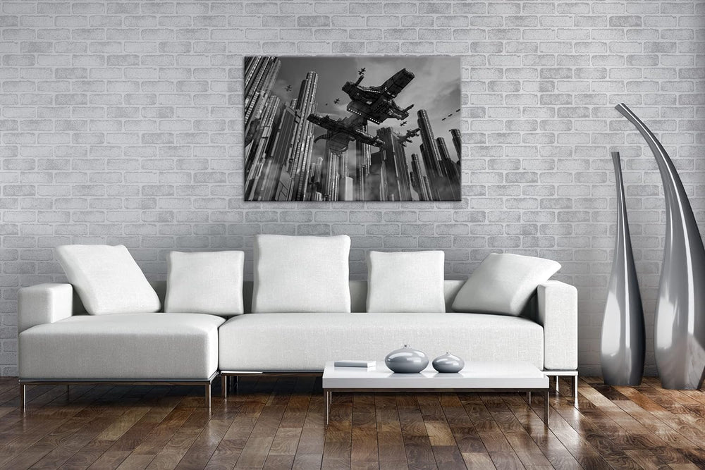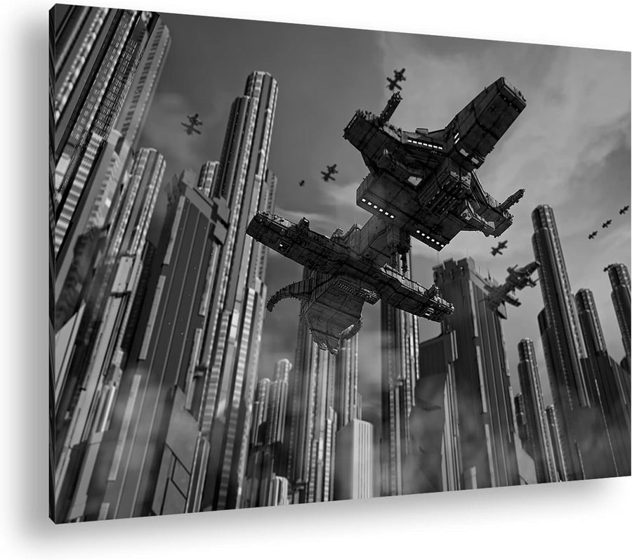 deyoli Raumschiff in einer Grossstadt Format: 80x60 Effekt: Schwarz&Weiss als Leinwandbild, Motiv fe
