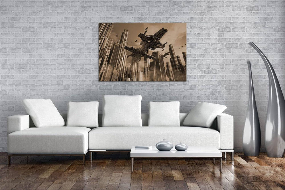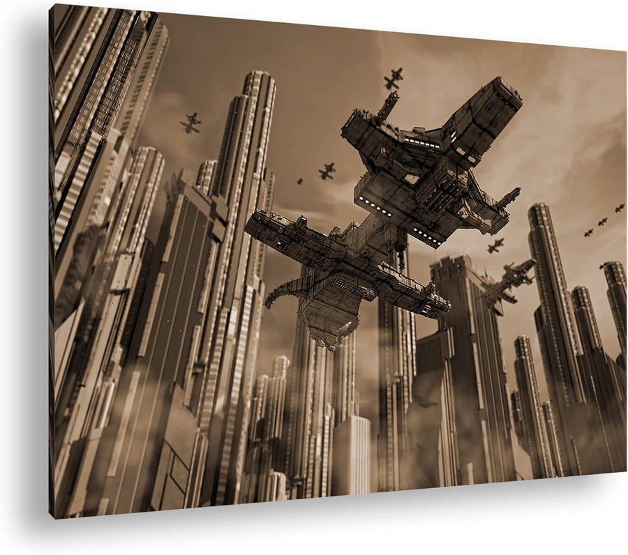 deyoli Raumschiff in einer Grossstadt Format: 80x60 Effekt: Sepia als Leinwandbild, Motiv fertig ger