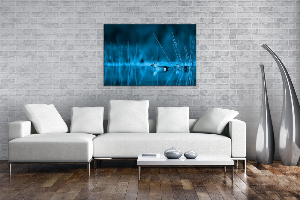 deyoli ruhige Enten auf einem See Format: 80x60 Effekt: Monocrome Blau als Leinwand, Motiv fertig ge