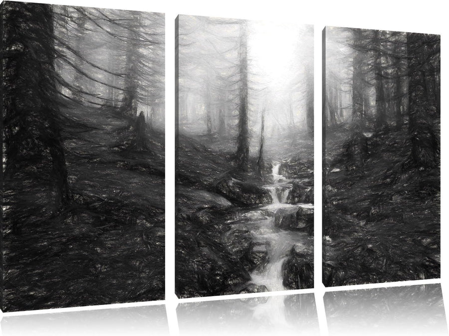 Pixxprint Bach im Wald Kunst / 3-Teilig/Gesamtmass 120cm Leinwandbild bespannt auf Holzrahmen/Wandbi