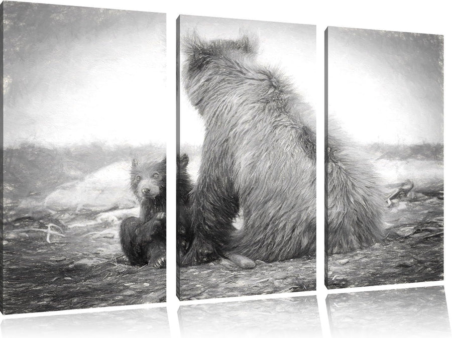 Pixxprint Bär mit Baby nach dem Baden Kunst Kohle Effekt 3-Teiler Leinwandbild 120x80 Bild auf Leinw