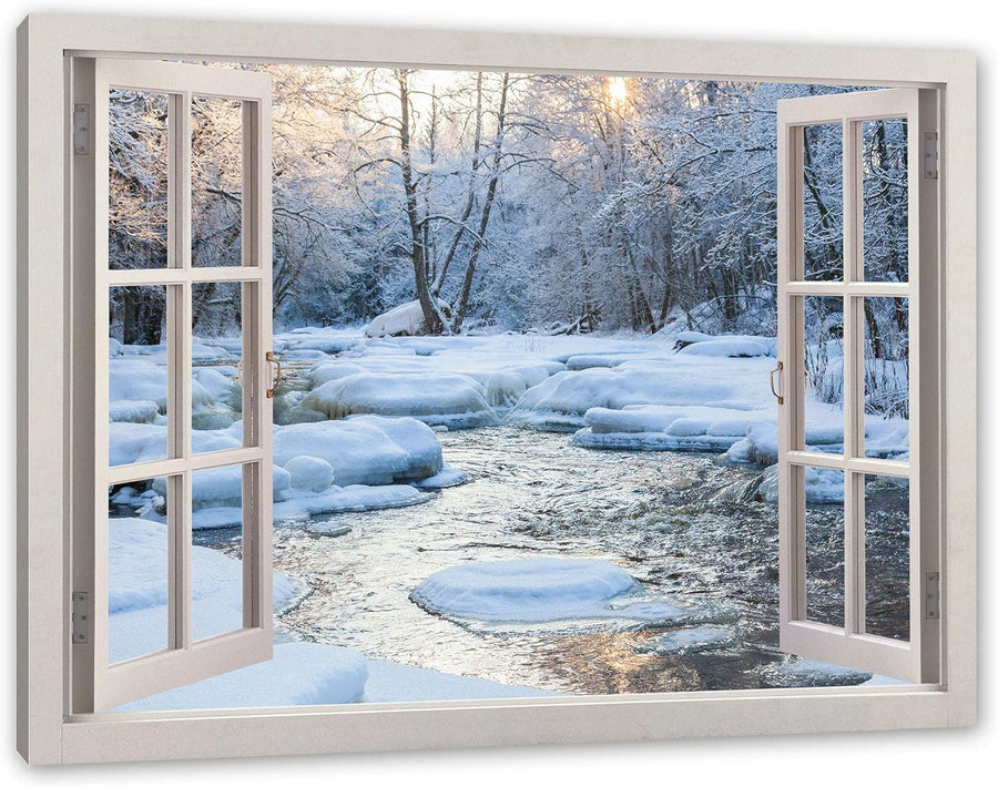 Pixxprint Bach in Winterlandschaft, Fenster Leinwandbild | Grösse: 100x70 cm | Wandbild | Kunstdruck