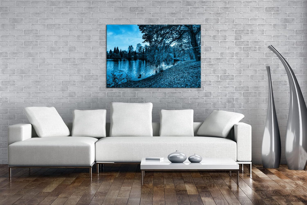 deyoli See in herbstlichen Farben Format: 80x60 Effekt: Monocrome Blau als Leinwand, Motiv fertig ge