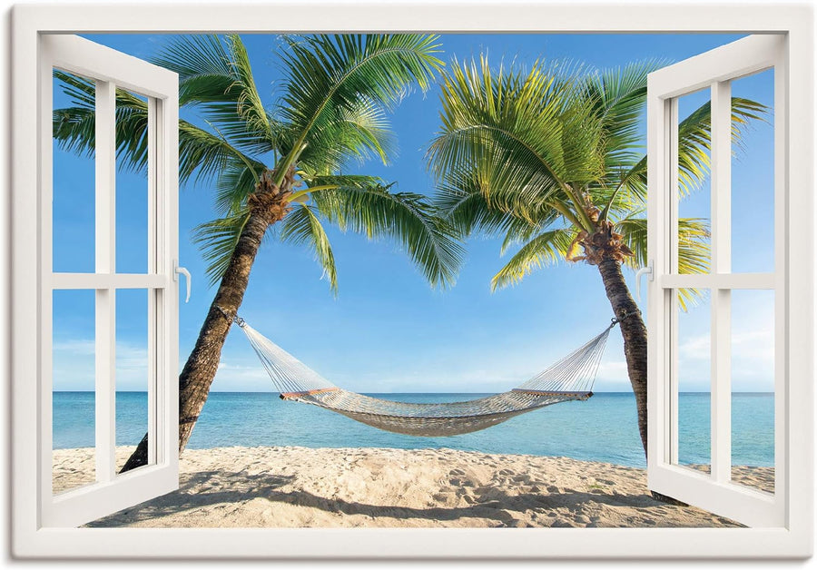 Artland Leinwandbild Wandbild Bild auf Leinwand 70x50 cm Wanddeko Fensterblick Fenster Strand Karibi
