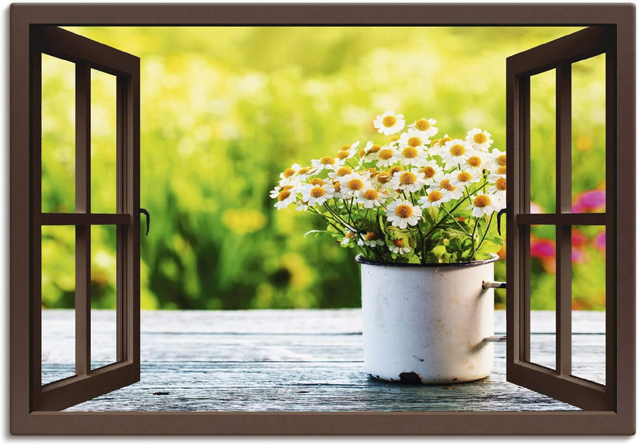 Artland Leinwandbild Wandbild Bild auf Leinwand 70x50 cm Wanddeko Fensterblick Fenster Botanik Blume