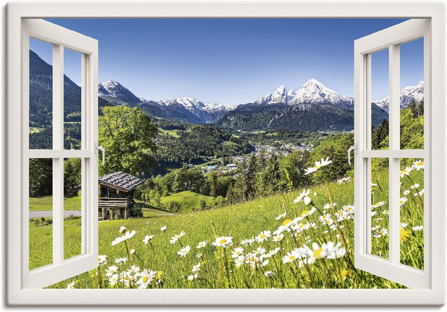 Artland Leinwandbild Wandbild Bild auf Leinwand 70x50 cm Wanddeko Fensterblick Fenster Alpen Landsch
