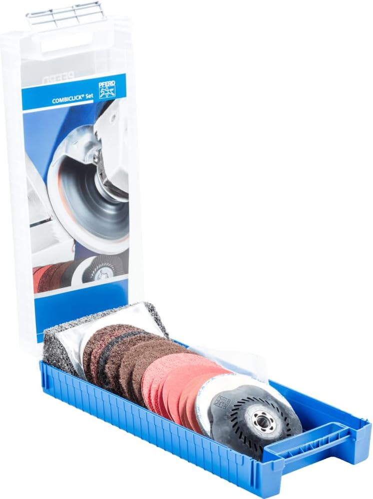 PFERD-COMBICLICK-Set, 19-teilig, Fiberschleifer, Filz- und Vlieswerkzeuge, Aussen-ø 125 mm, Gewinde