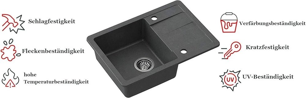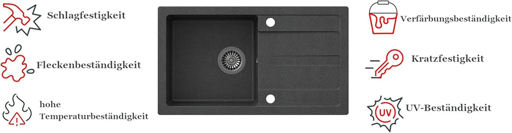 VBChome Spülbecken mit Armatur Schwarz 77 x 43,5 cm Granit Einzelbecken Einbauspüle Abtroffläche ges