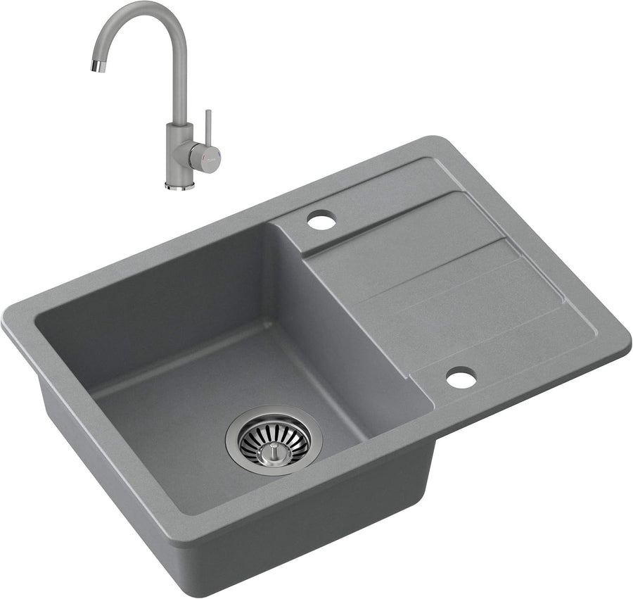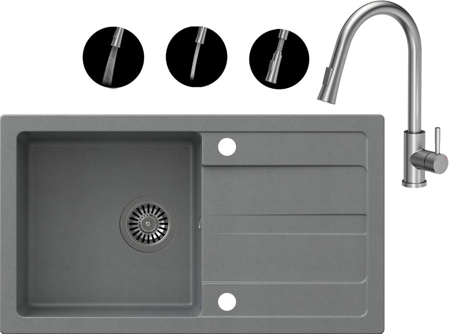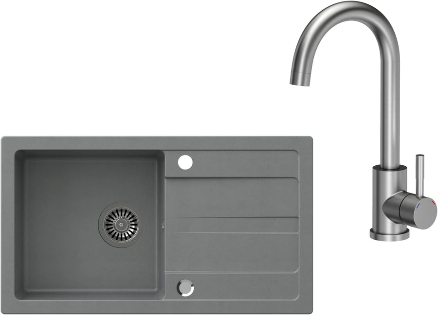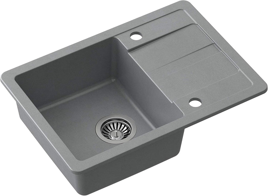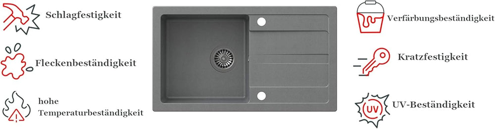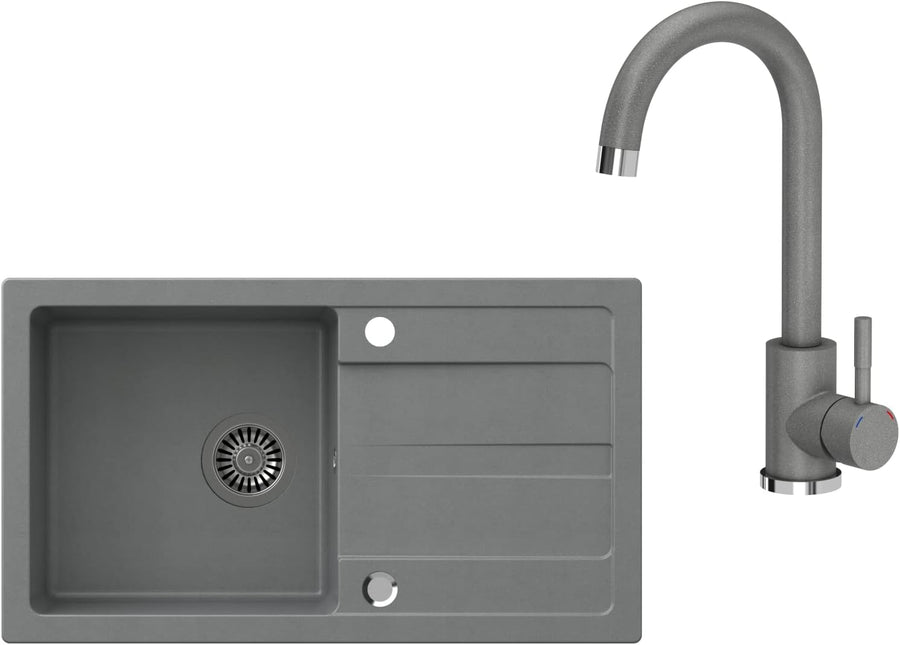 VBChome Spülbecken mit Armatur Grau 77 x 43,5 cm Granit Einzelbecken Einbauspüle Abtroffläche gespre
