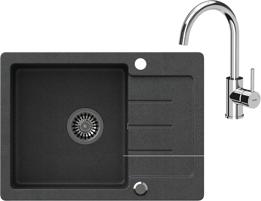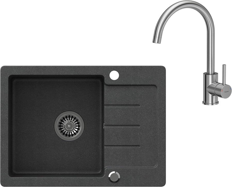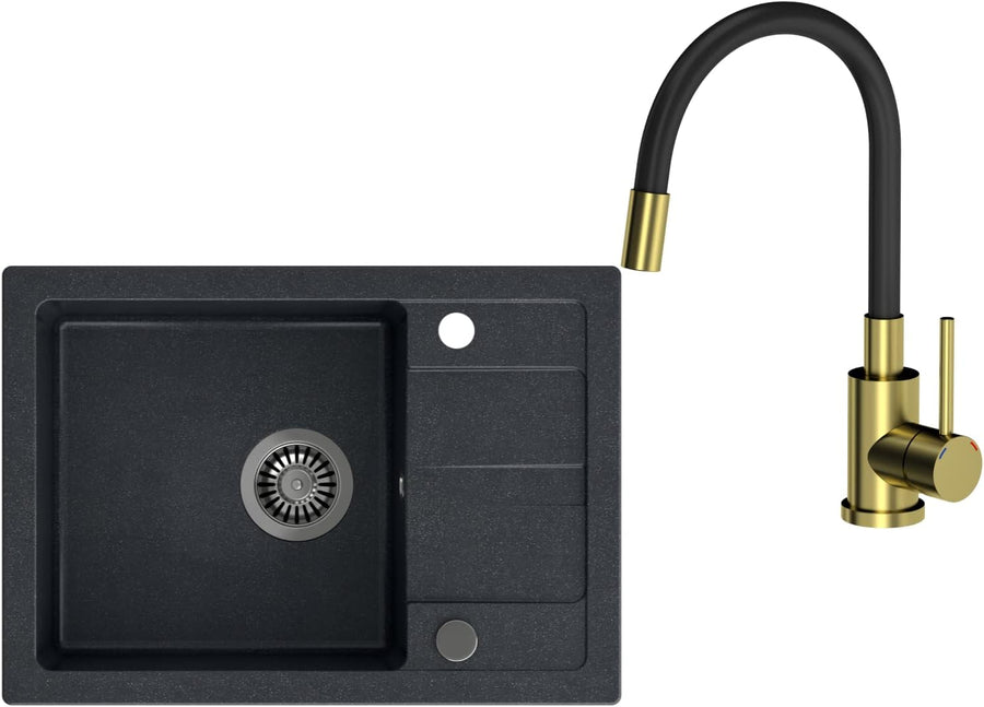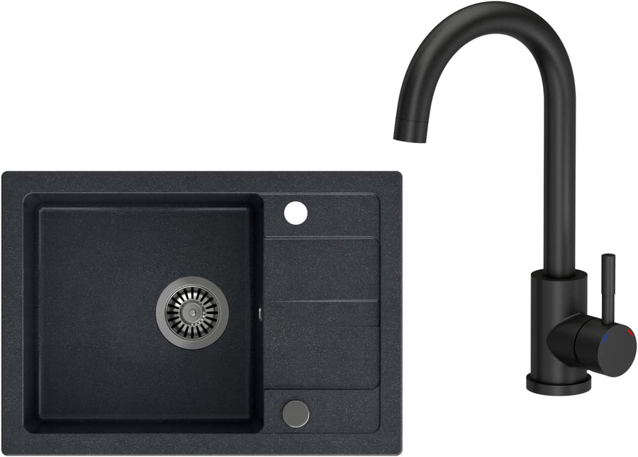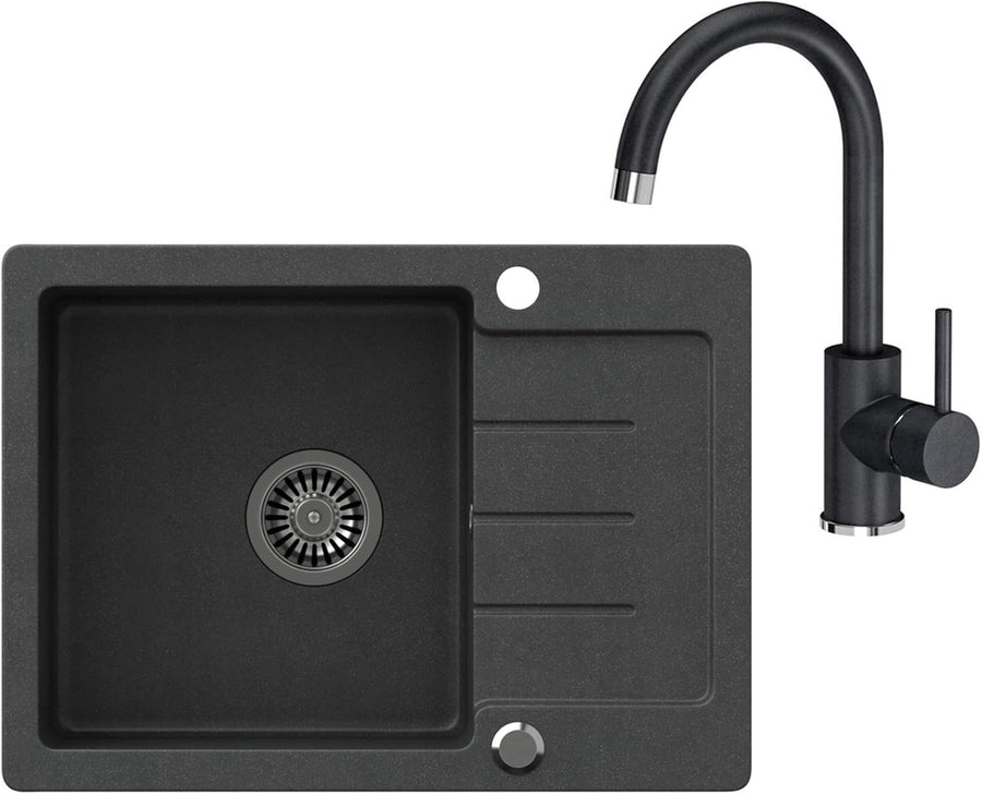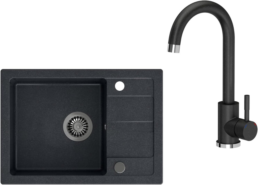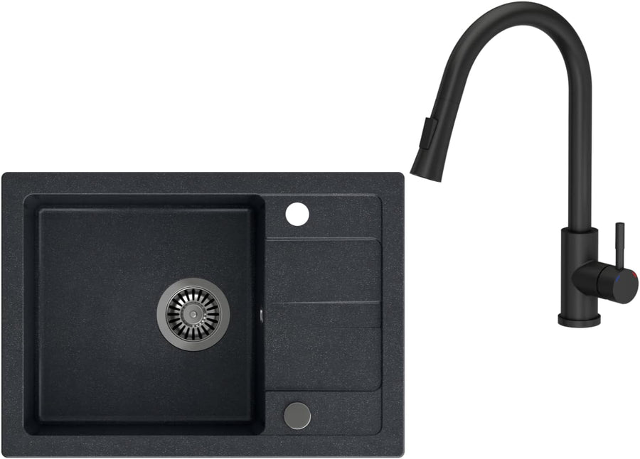 VBChome Spülbecken Schwarz mit Armatur 60 x 44 cm mit Spültischarmatur Granit Einzelbecken Einbauspü