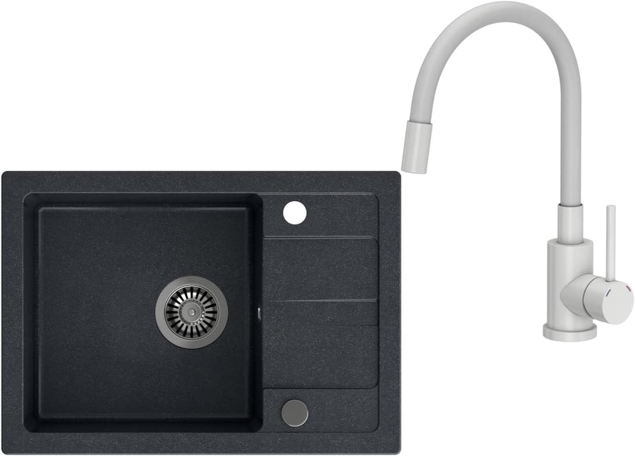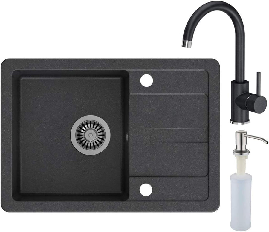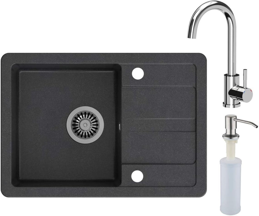 VBChome Spülbecken mit Armatur Schwarz 62 x 44 cm Granit Einzelbecken Einbauspüle Abtroffläche gespr