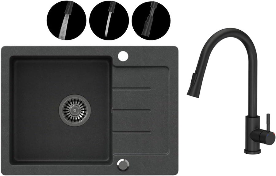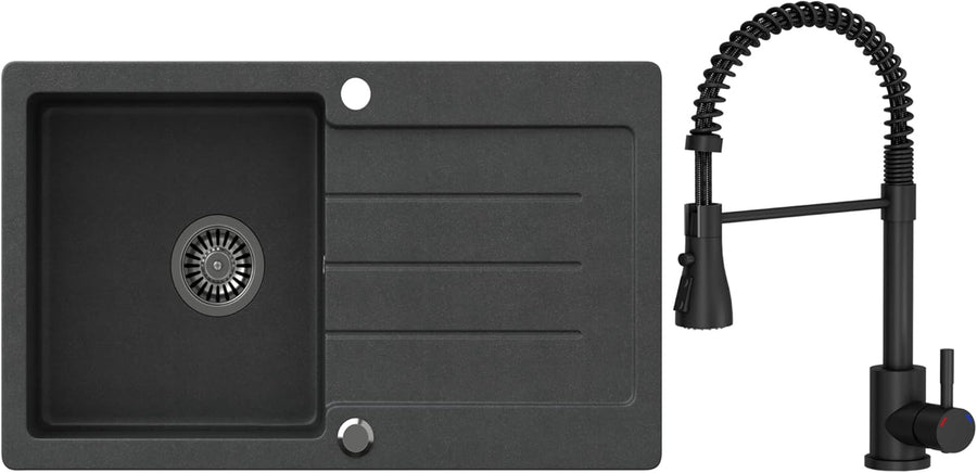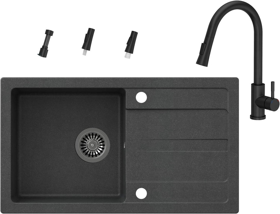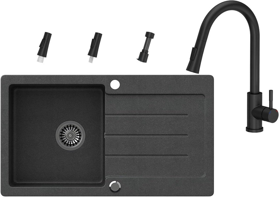 VBChome Spülbecken mit Armatur Schwarz 77 x 44 cm 3 Leistungsstufen Granit Einzelbecken Einbauspüle