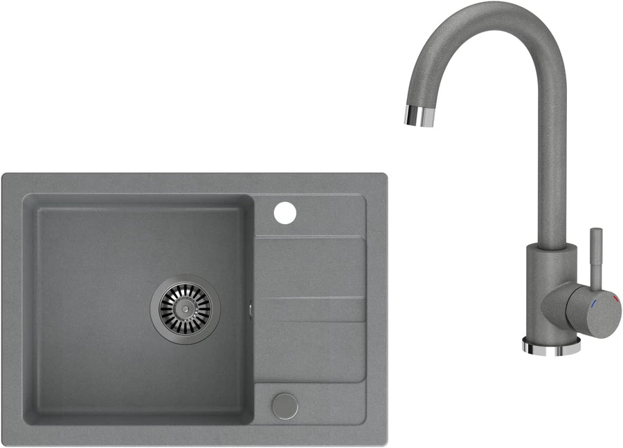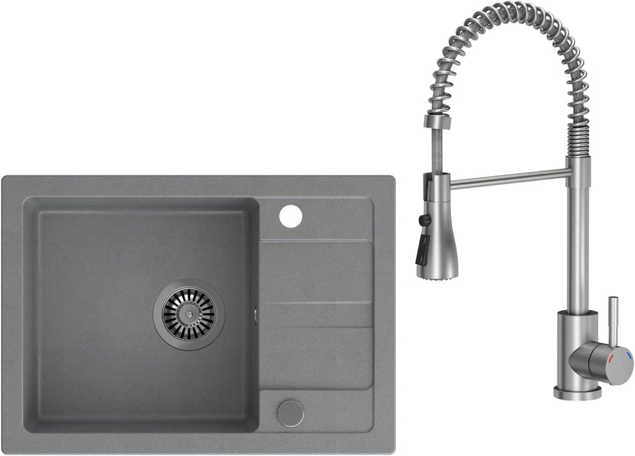 VBChome Spülbecken mit Armatur Grau 62 x 44 cm Granit Einzelbecken Einbauspüle Abtroffläche Gesprenk