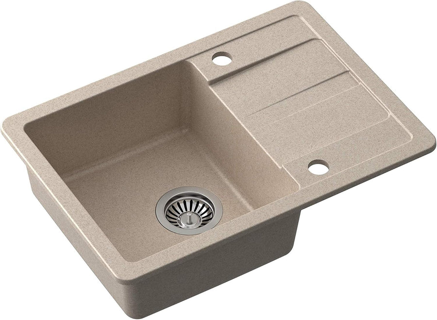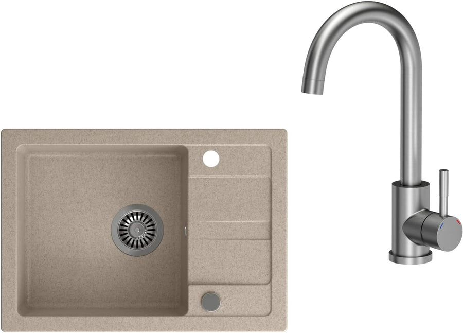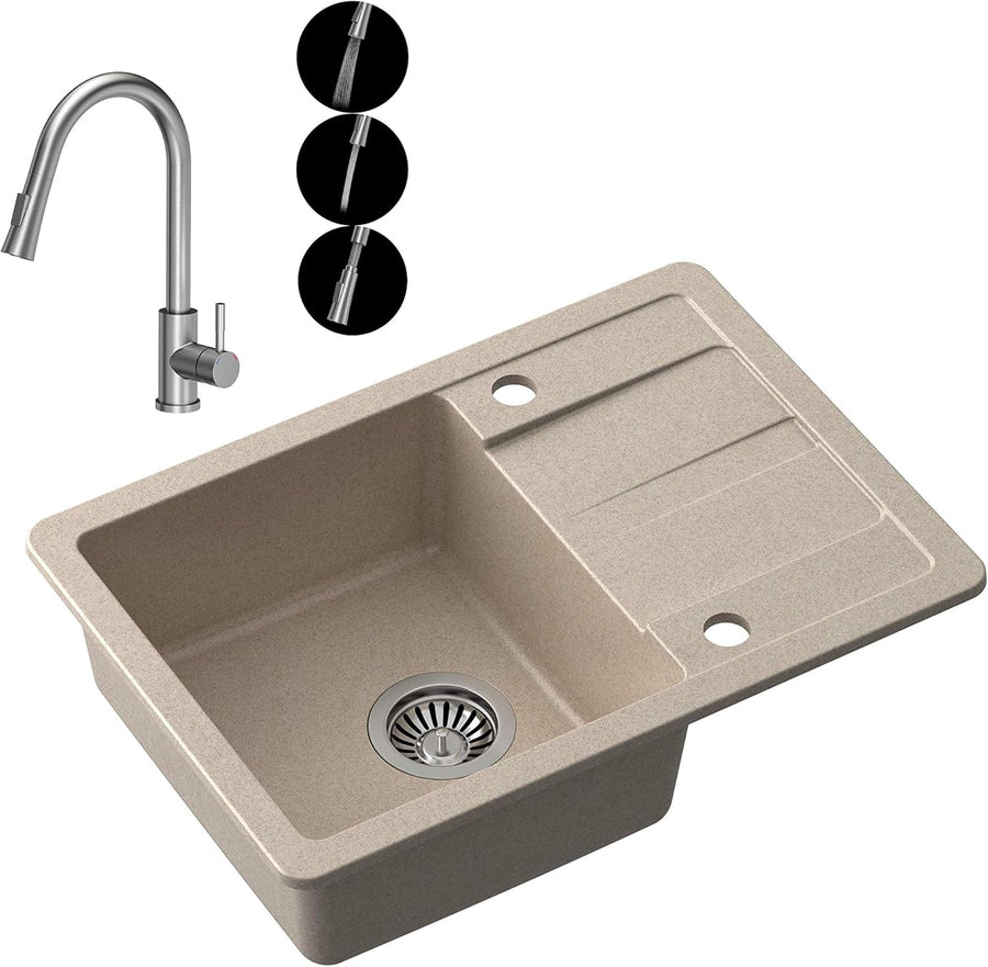 VBChome Spülbecken mit Armatur Beige 62 x 44 cm Granit Einzelbecken Einbauspüle Abtroffläche gespren