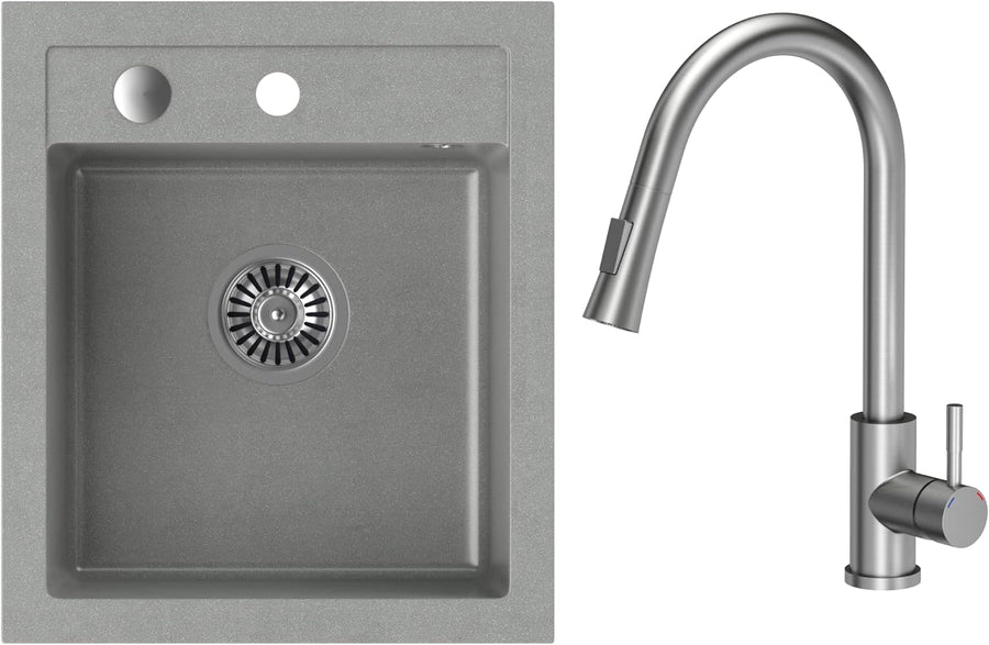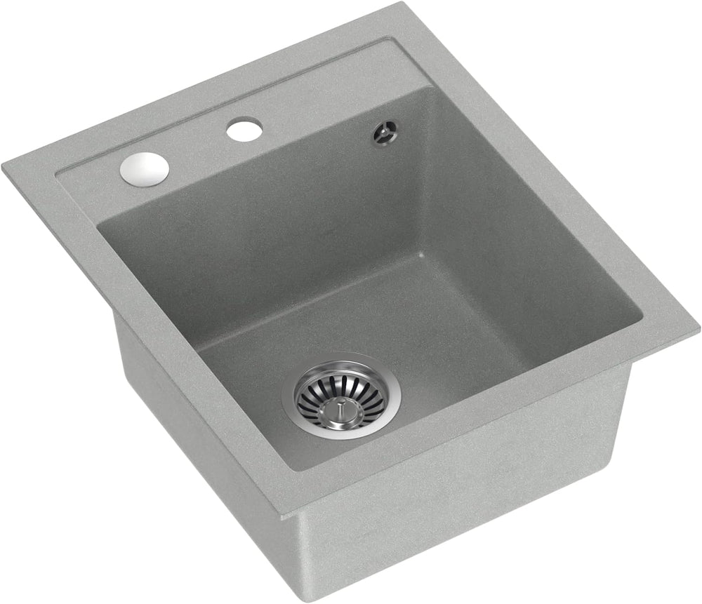 VBChome Spülbecken mit Armatur Grau 43 x 50 cm Granit Einzelbecken Einbauspüle gesprenkelt Verbundsp