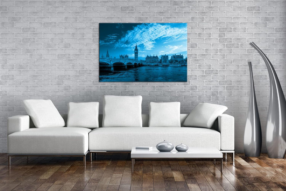deyoli Skyline London Format: 80x60 Effekt: Monocrome Blau als Leinwandbild, Motiv fertig gerahmt au