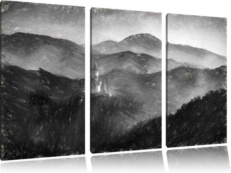 Pixxprint Buddha Bild im Tal der Dunkelheit Kunst Kohle Effekt 3-Teiler Leinwandbild 120x80 Bild auf