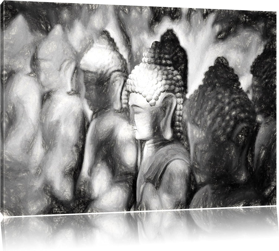 Pixxprint Buddha-Statuen in Einer Reihe / 100x70cm Leinwandbild bespannt auf Holzrahmen/Wandbild Kun