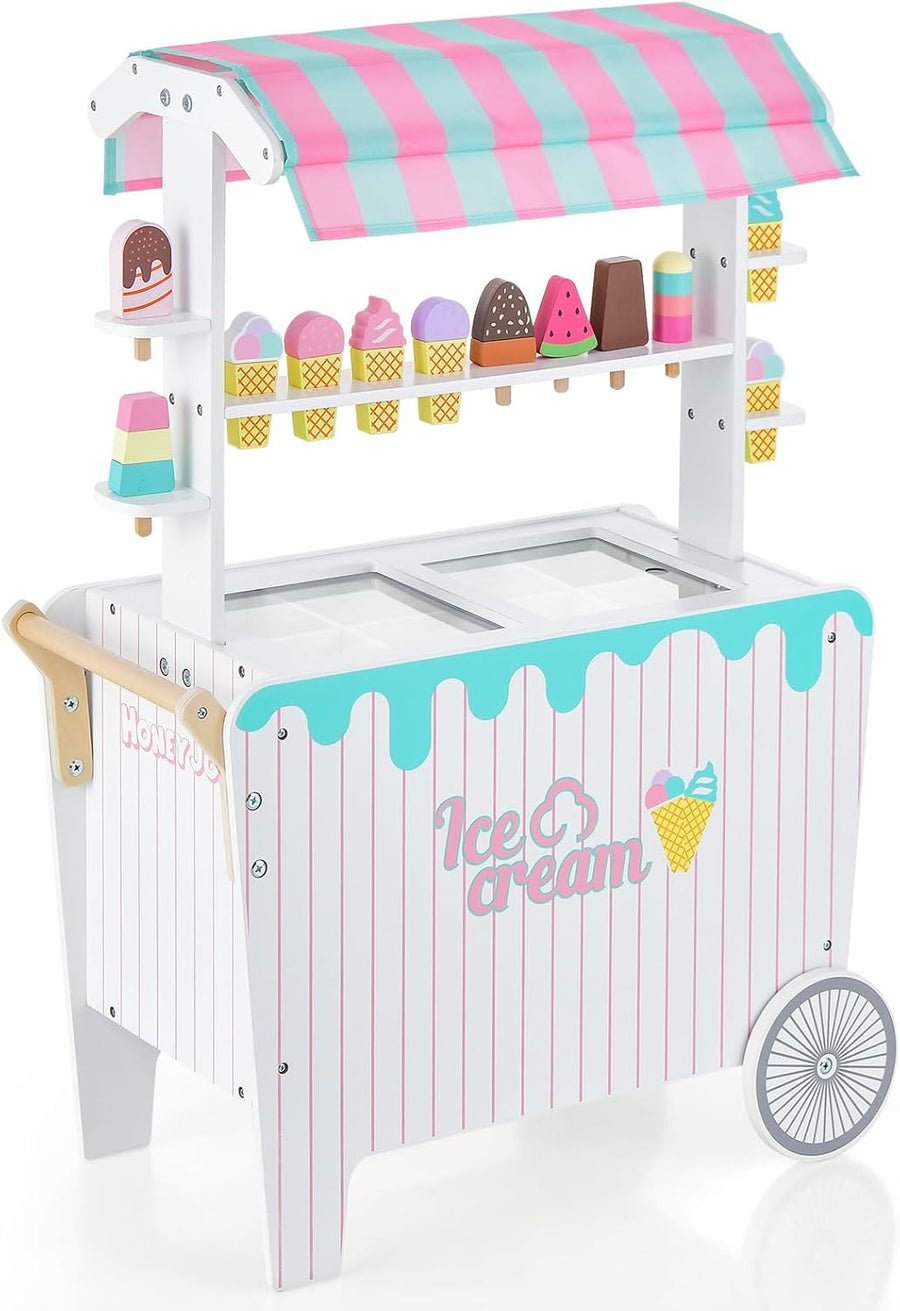COSTWAY Kinder Eiswagen mit 12 Eiscreme, Kaufladen aus Holz mit 2 Rädern, Schiebegriff & Baldachin,