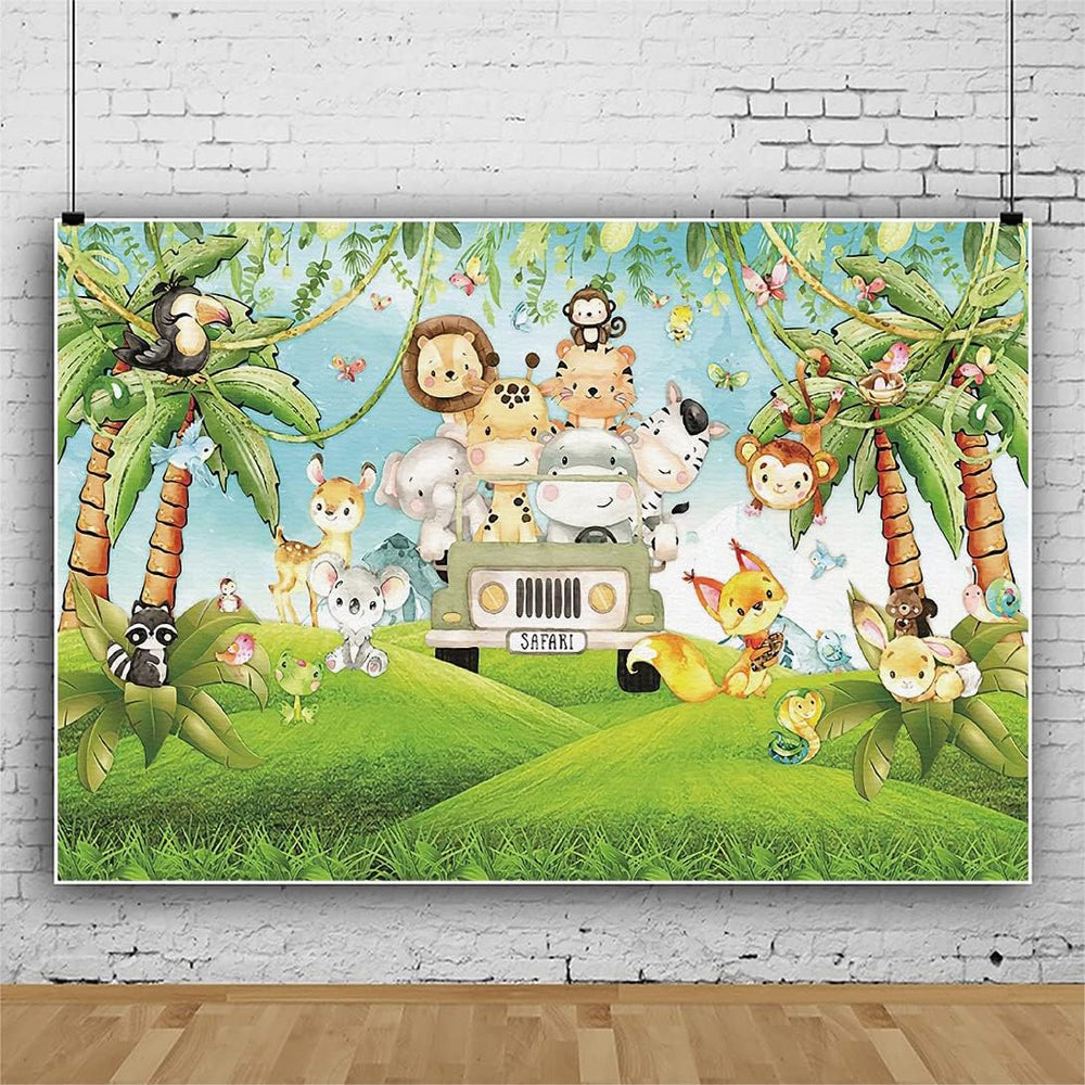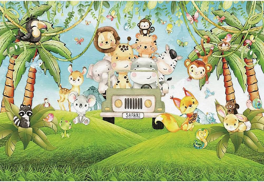 Renaiss 3x2.5m Dschungel Tiere Geburtstag Hintergrund Nettes Tier Grün Auto Palme Rasen Fotografie H